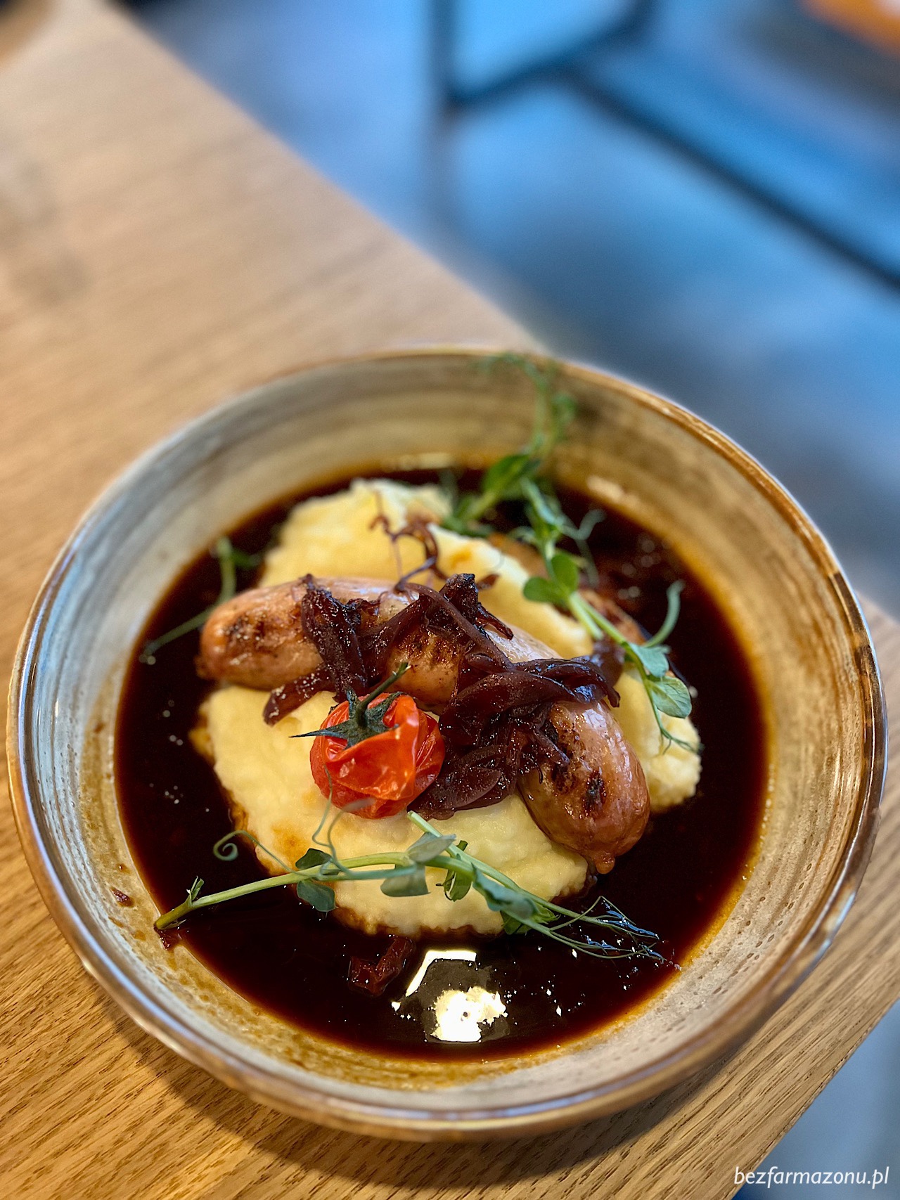 Przed prawdziwą klapą, sytuację ratowała niezła pieczona biała kiełbasa z karmelizowaną cebulką i pomidorkami (25 PLN). Co prawda, otoczone demi glace’ową fosą, ziemniaczane puree było raczej wodniste aniżeli puszyste, ale okey nie będę się aż tak czepiał szczegółów.