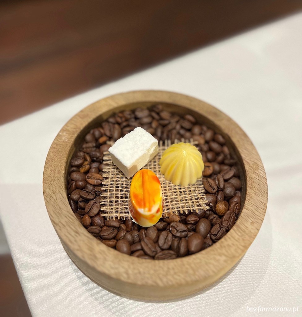 W ramach petit fours otrzymaliśmy dwie praliny z musami: mango – jogurt oraz truskawka plus waniliowy marshmallow. Dwie pierwsze super, ale domowa pianka kompletnie nam nie podeszła.