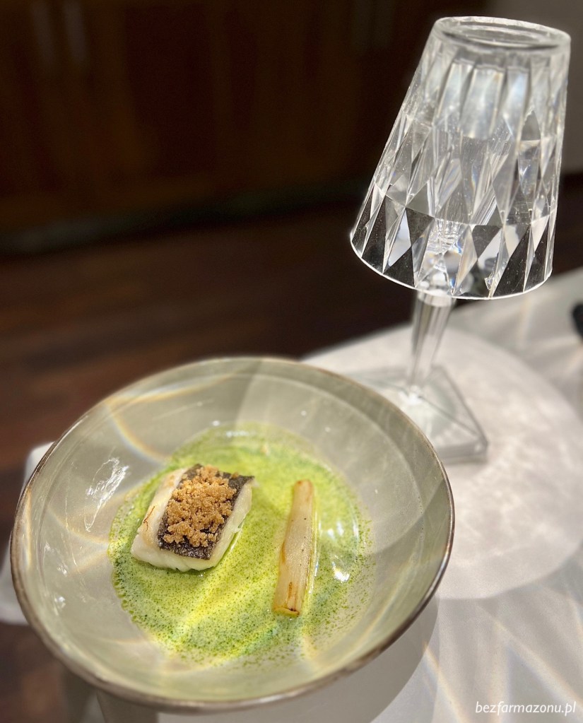 Po chwili odpoczynku pojawiło się pierwsze z dań głównych. Przeciągnięty… i suchawy Halibut Sterling z pachnącym zupą ogórkową fantastycznym sosem na bazie zsiadłego mleka i oliwy koperkowej. Na rybie prażony amarantus, a przy niej pieczona skorzonera inaczej zwana wężymordem.