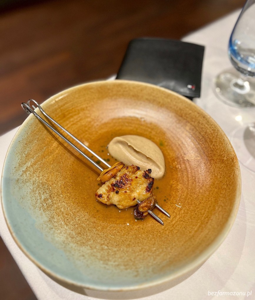 Szaszłyk z trybowanego kurzęcego skrzydełka oraz muli z glejzem z sosu sojowego, ziaren kolendry i miodu trochę nas zaskoczył. Połączenie drobiu z owocami morza to odważne posunięcie. Na boku niesamowicie kremowe, niewątpliwie najlepsze jakie do tej pory jadłem w życiu puree z selera. Powyższe zanurzone w bulionie na bazie kurczaka oraz pasty miso.