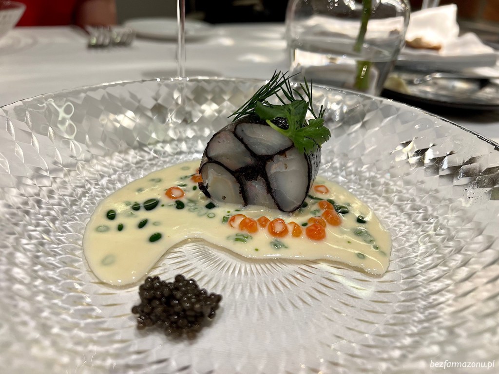 Pierwszym starterem był gotowany około piętnaście minut w niskiej temperaturze, nieprzeciągnięty i ultradelikatny Dorsz Skrei®. Zawinięty w nori spoczywał na sosie na bazie maślanki z ikrą z łososia i szczypiorkiem. Obok szczypta kawioru z jesiotra.