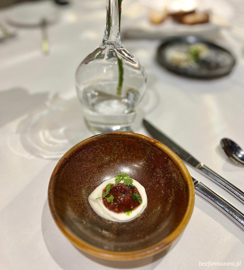Amouse – bouche reprezentowało ciekawe chutney z truskawek i jabłka z dodatkiem chili i gorczycy, kwaśną śmietaną oraz bazyliową oliwą.