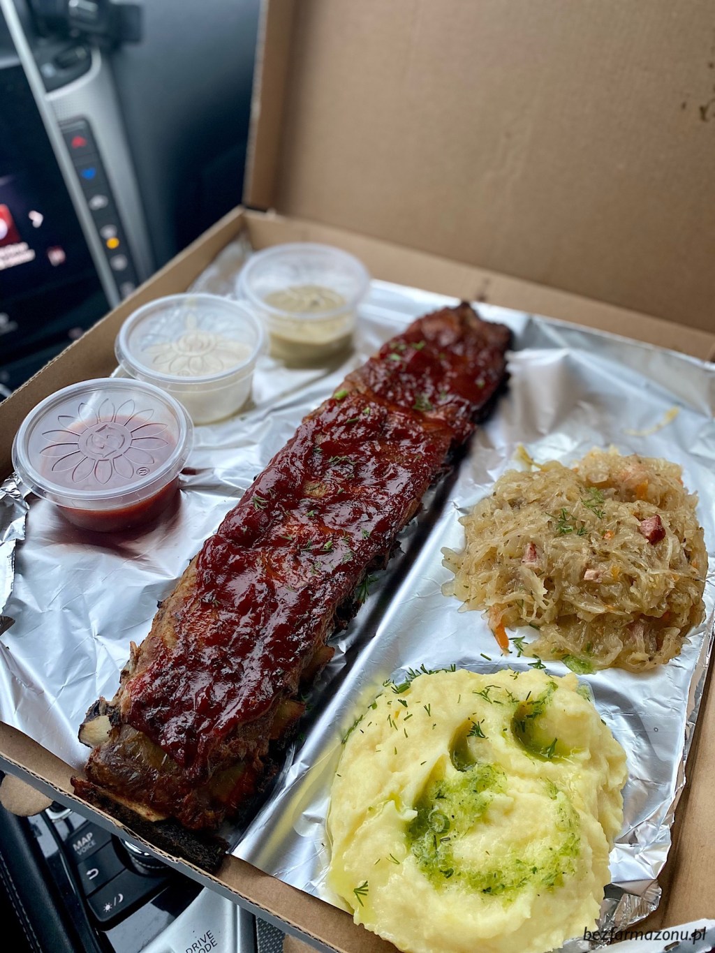 Drugie zamówienie – wieprzowe żeberka w glazurze bbq (39 PLN). Bardzo dobrze wspominam gładkie, maźnięte pesto, ziemniaczane puree oraz świetną, odrobinę kwaskowatą zasmażaną kapuchę. Na plus zaliczyłem również mocny chrzan.