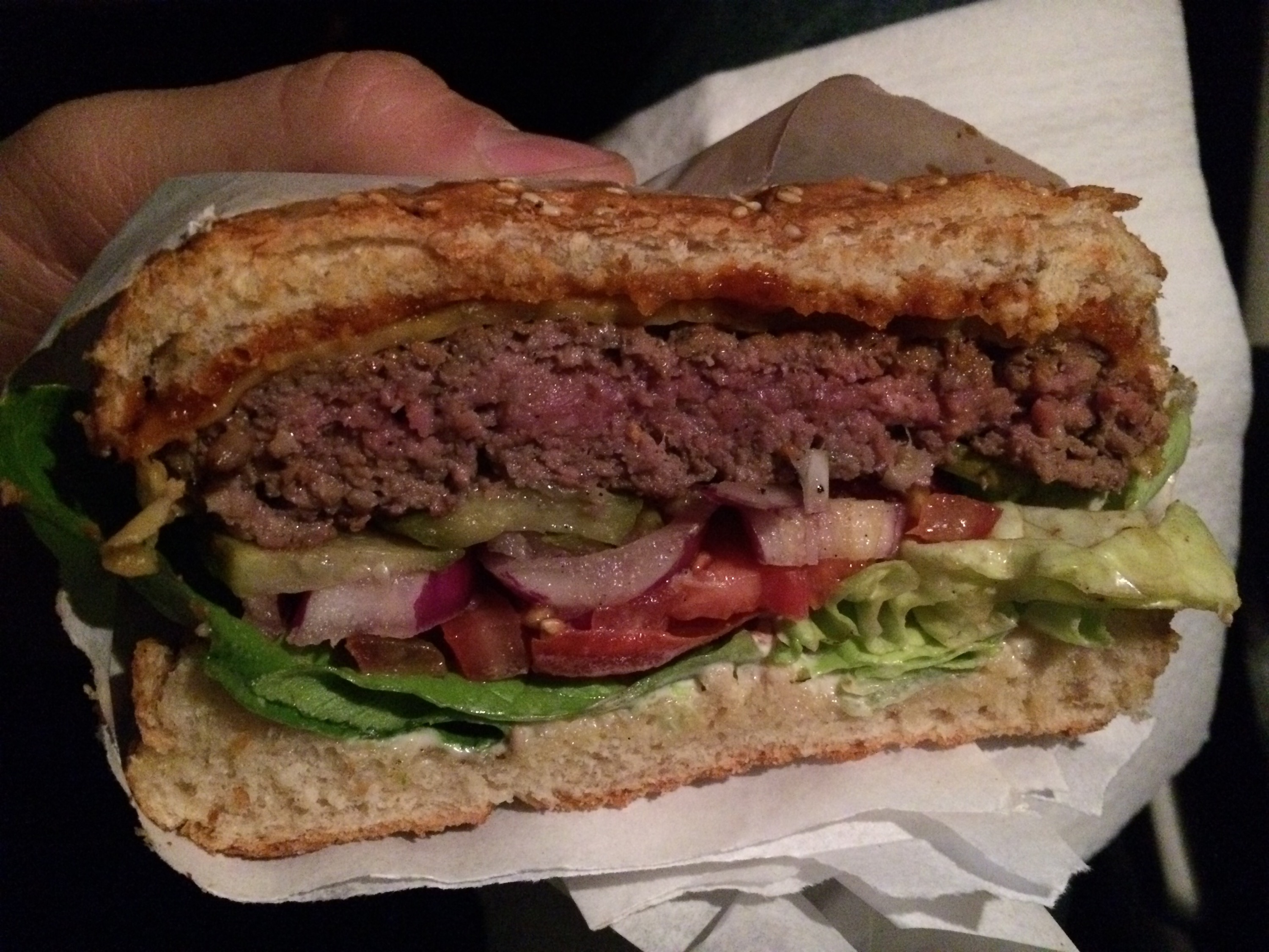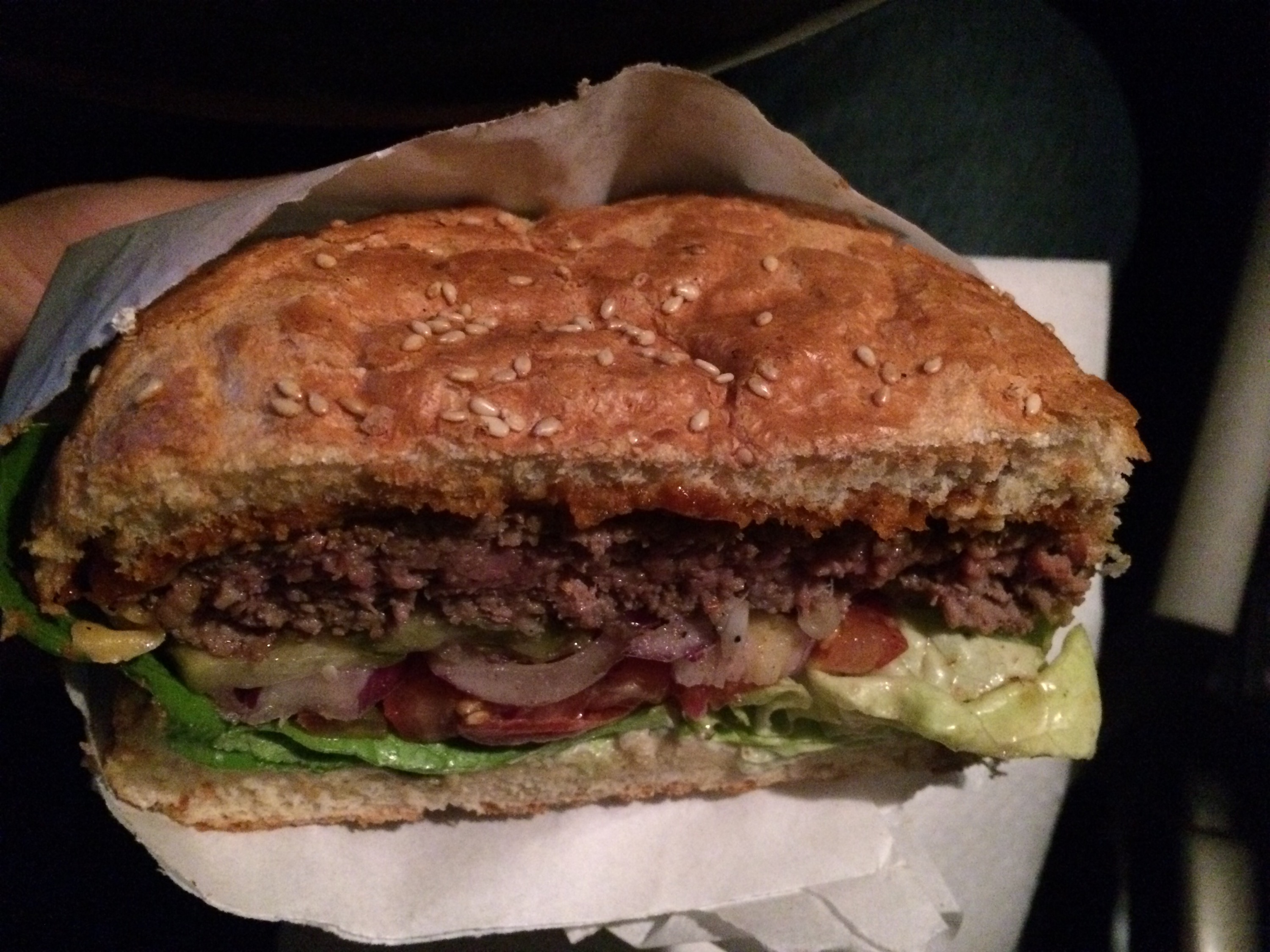 Mięso nie było już takie przepieprzone (w sensie, że nie szczypało w język), smakowało doskonale, a standardowe dodatki były dla niego tłem (w końcu znajdowało się tam 360g wołu). Posmakował mi bardzo konserwowy podłużny ogórek. Sezamowa bułka jak widać na zdjęciu była bardzo cieniutka i lekko zamokła, ale wzorowo poradziła sobie z naporem wnętrzności i do samego końca trzymała je w ryzach. Klasa!