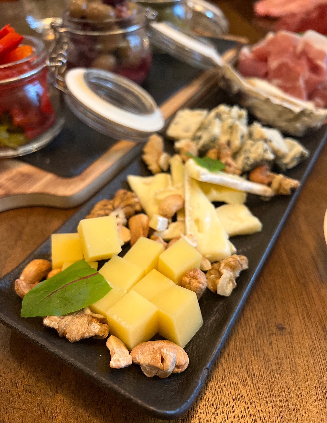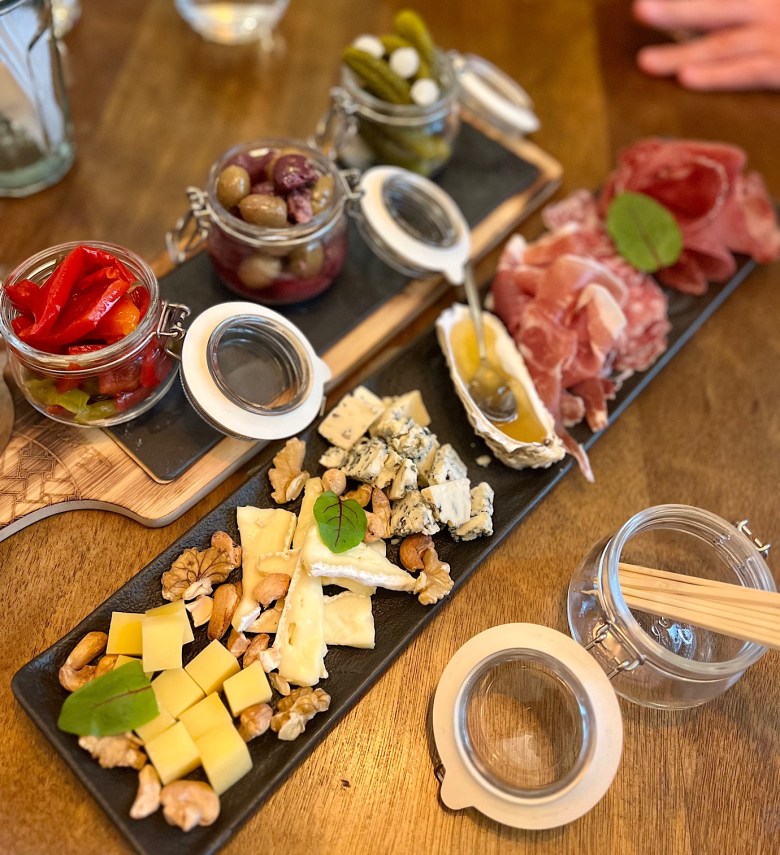 Rozpoczęliśmy od deski z trzema rodzajami serów i wędlin, miodem i orzechami (50 PLN) …