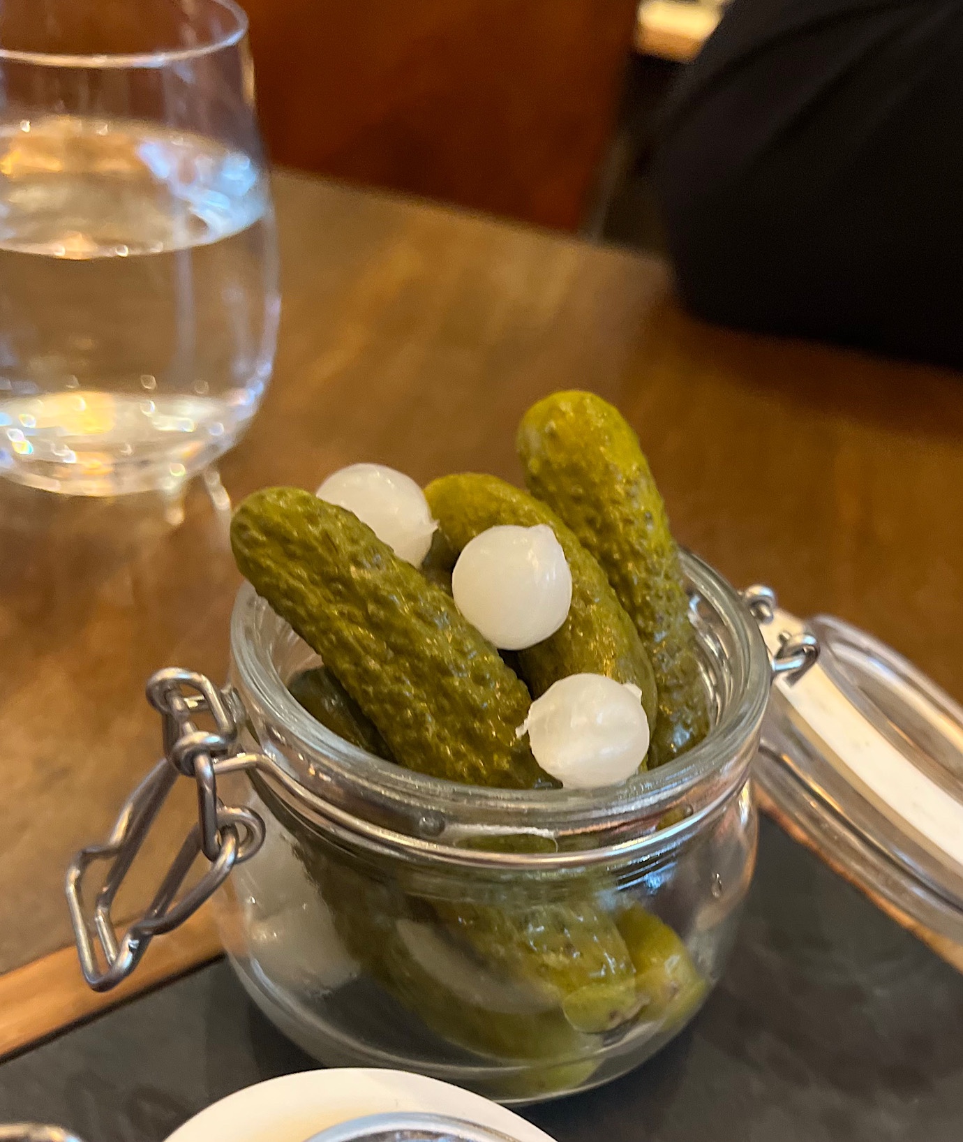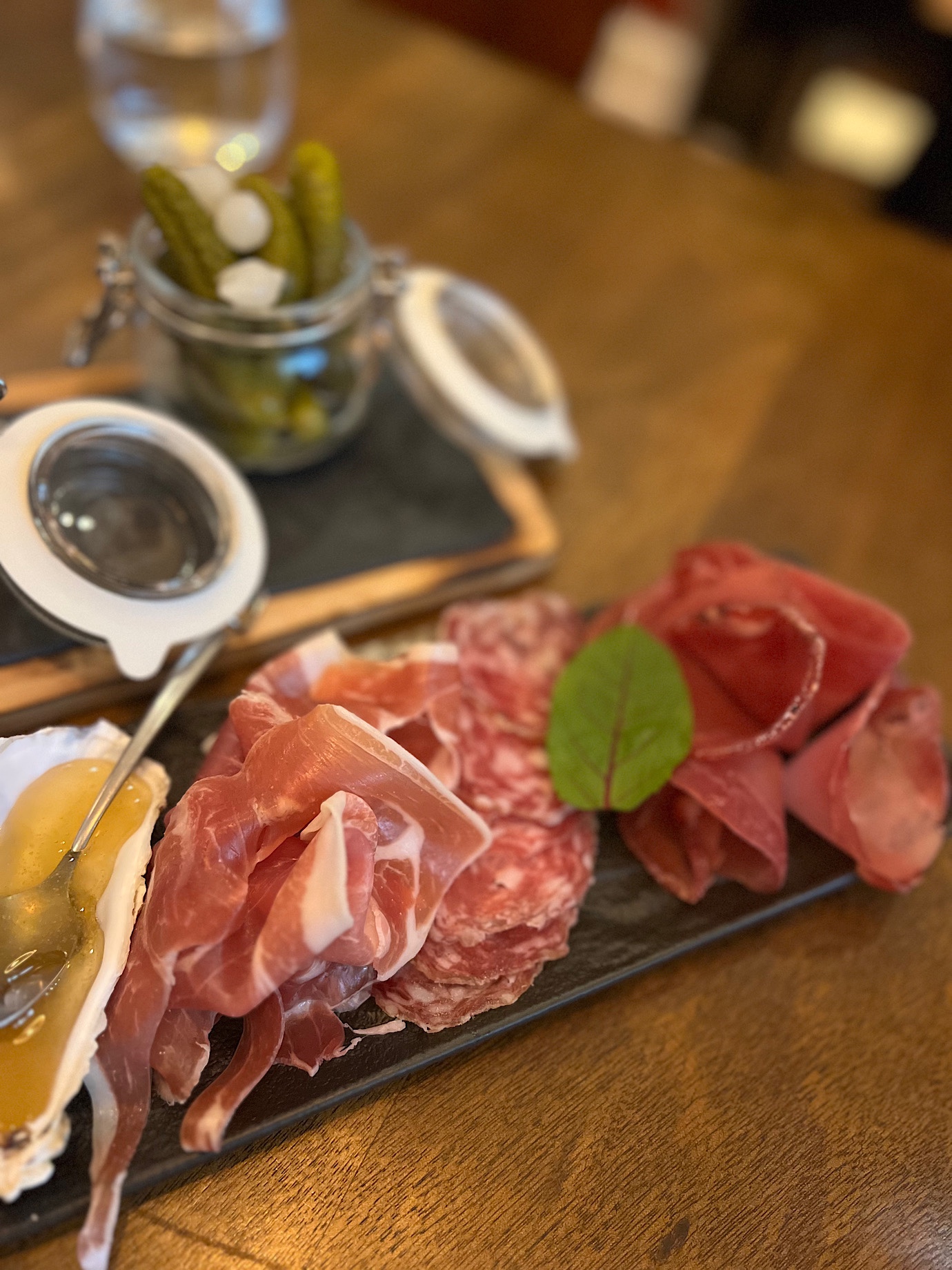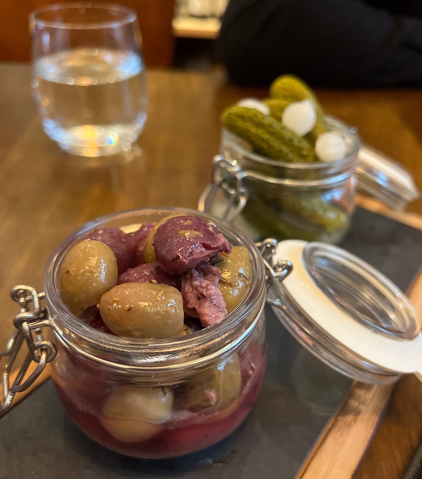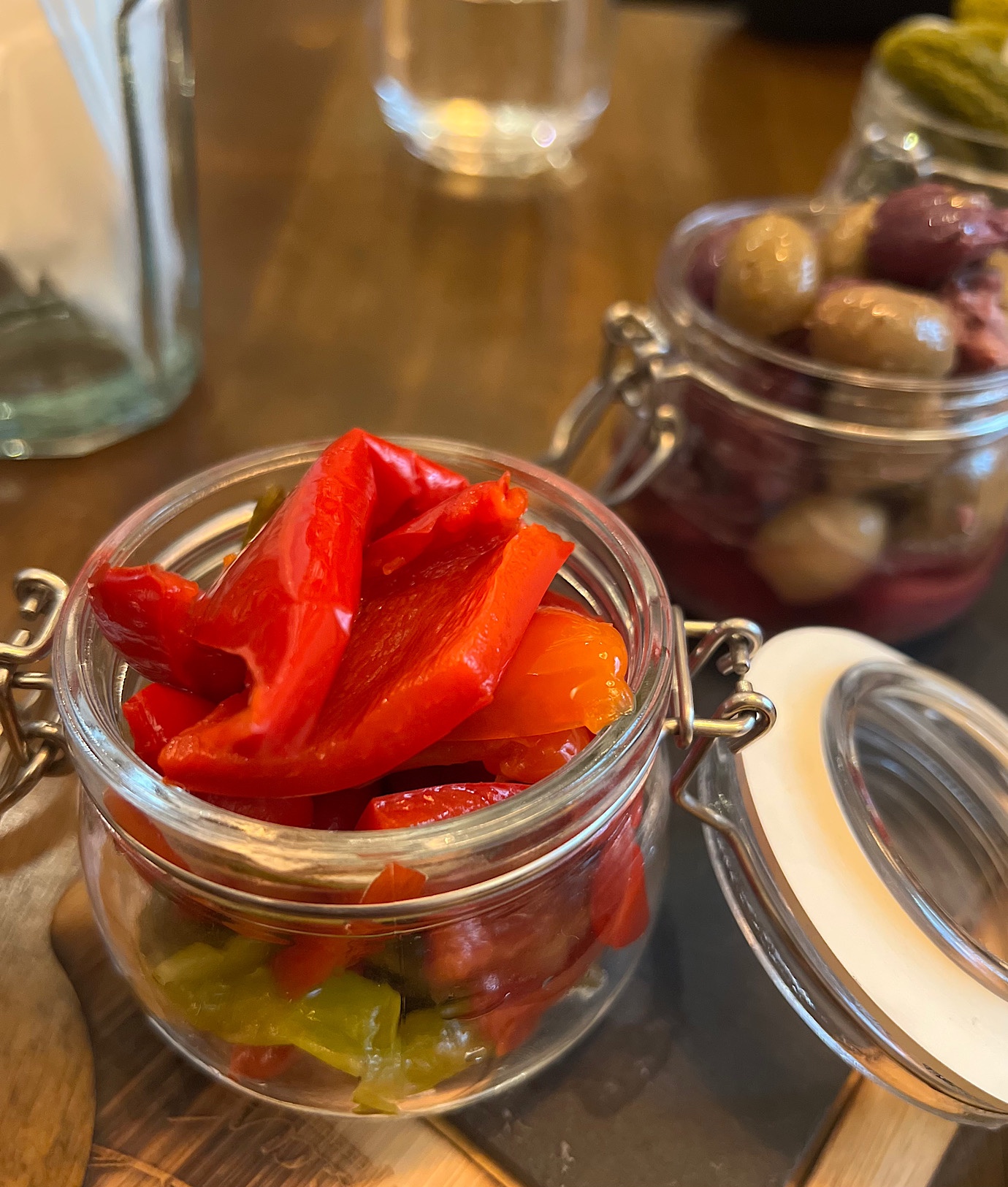 … wraz z selekcją zbyt miękkich oliwek, korniszonów z cebulką (szkoda, że nie domowej roboty) oraz marynowanej papryki z ostrymi papryczkami (20 PLN).