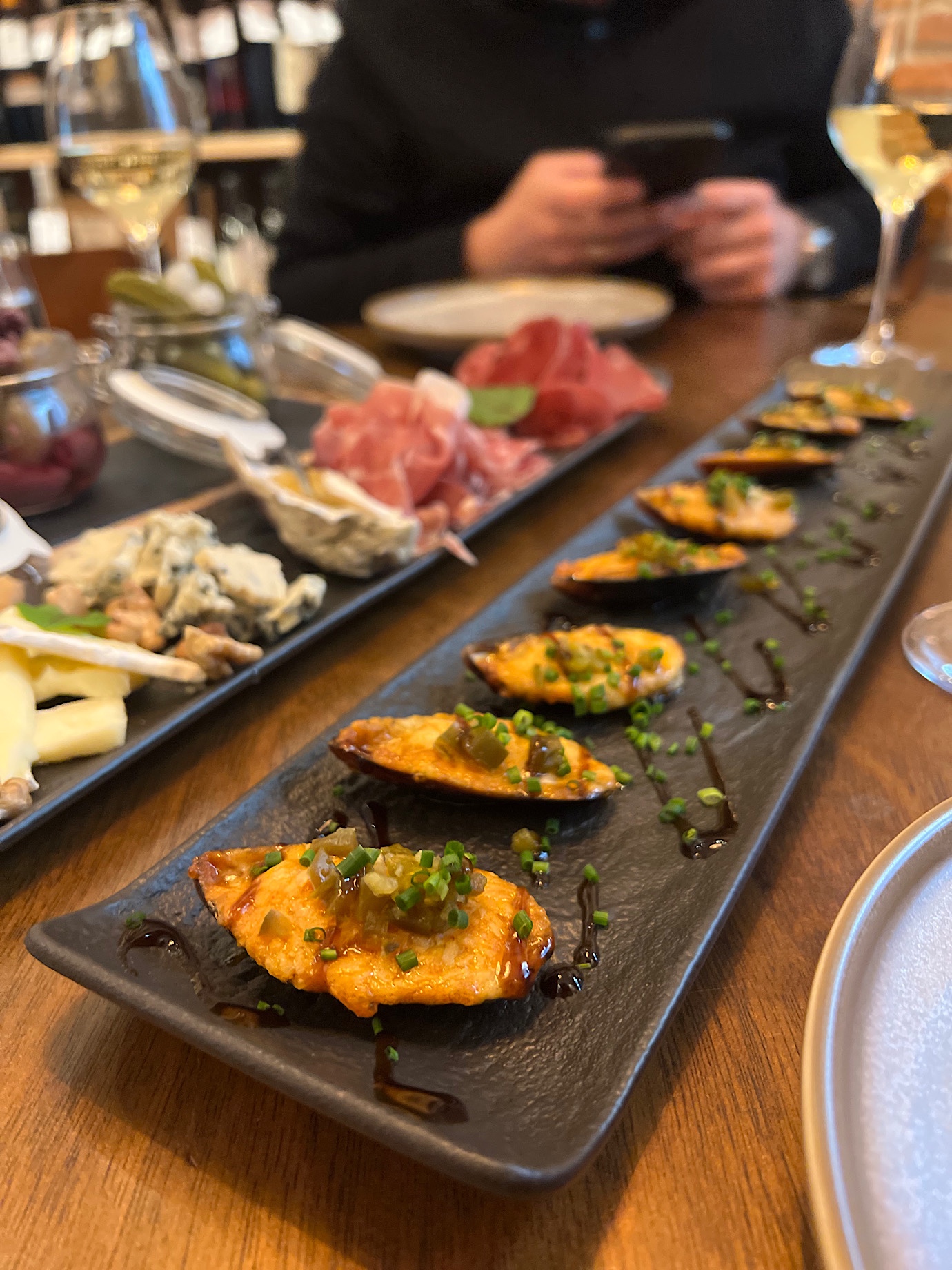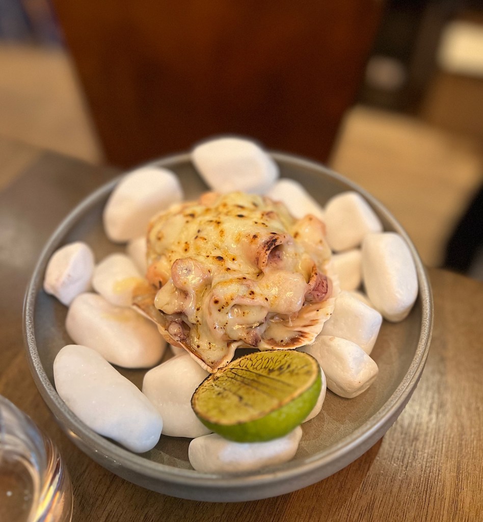 Nasze serca bezapelacyjnie skradły zapieczone pod cheddarem chilijskie małże z podobno domowym majonezem, szczyptą jalapeno i ostrygowym sosem (26 PLN).