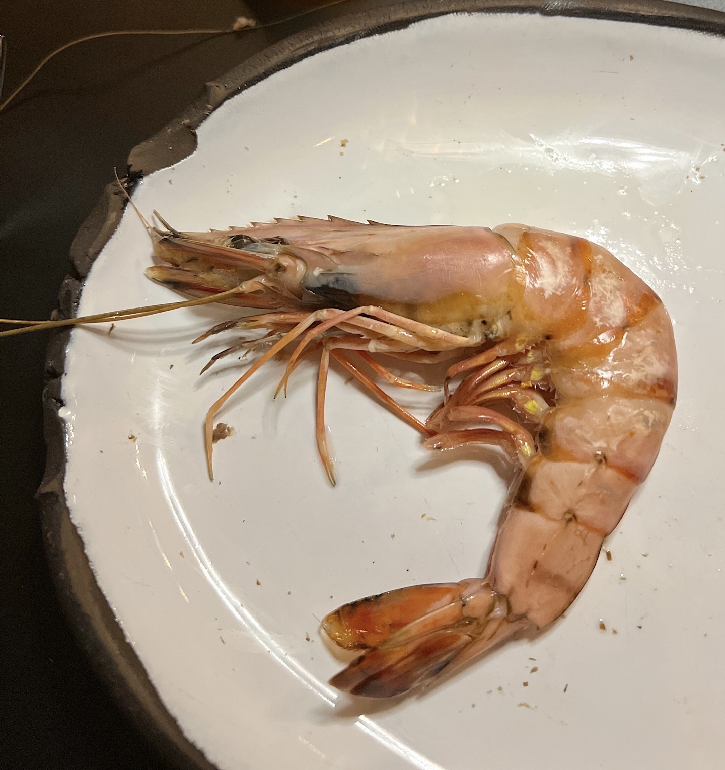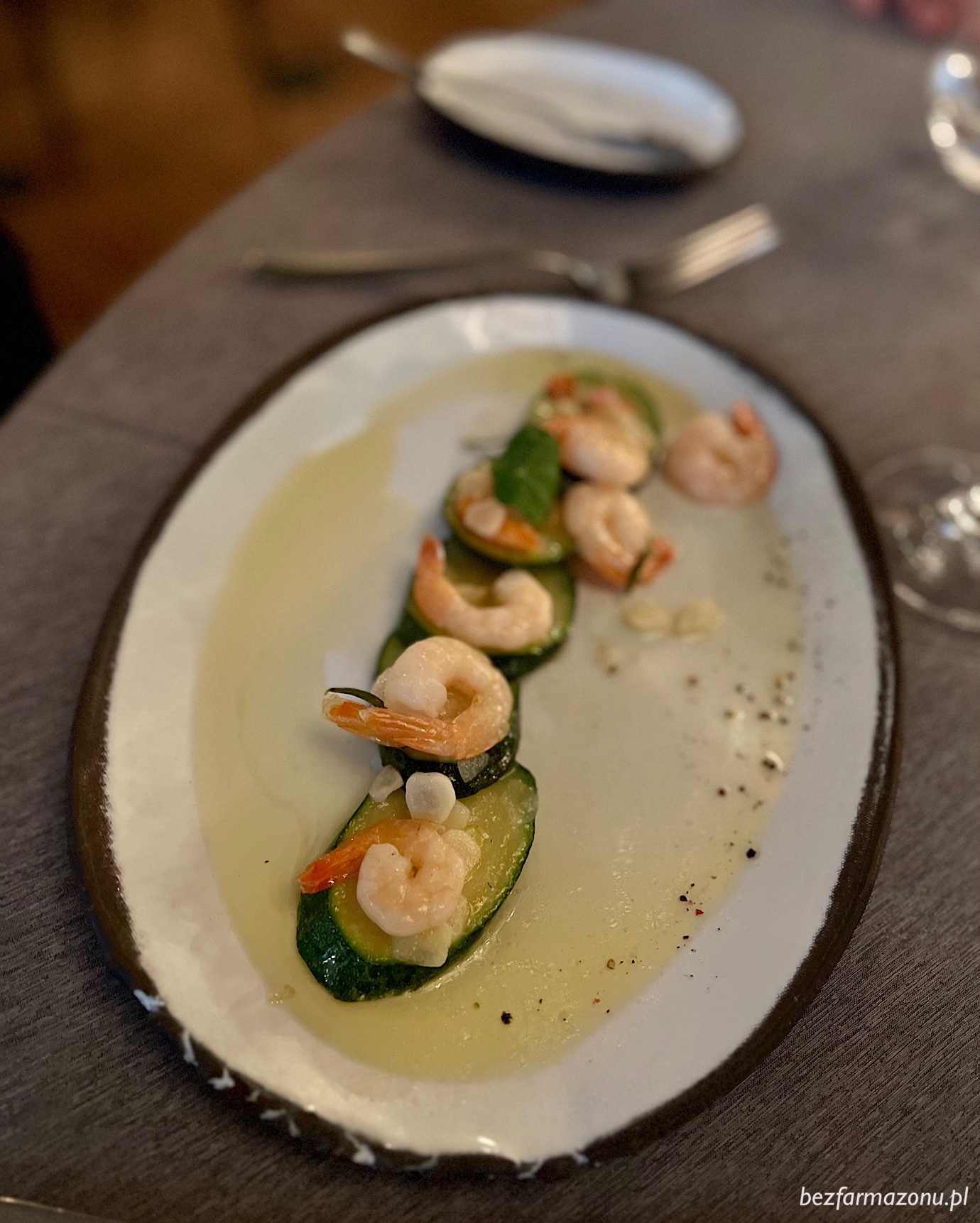 Szef kontemplował fenomenalne według Niego zapiekane przegrzebki w sosie porowym (59 PLN). R. i E. smakowali w ciszy krewetki w maśle z czosnkiem, cukinią, papryczkami i rozmarynem (44 PLN).