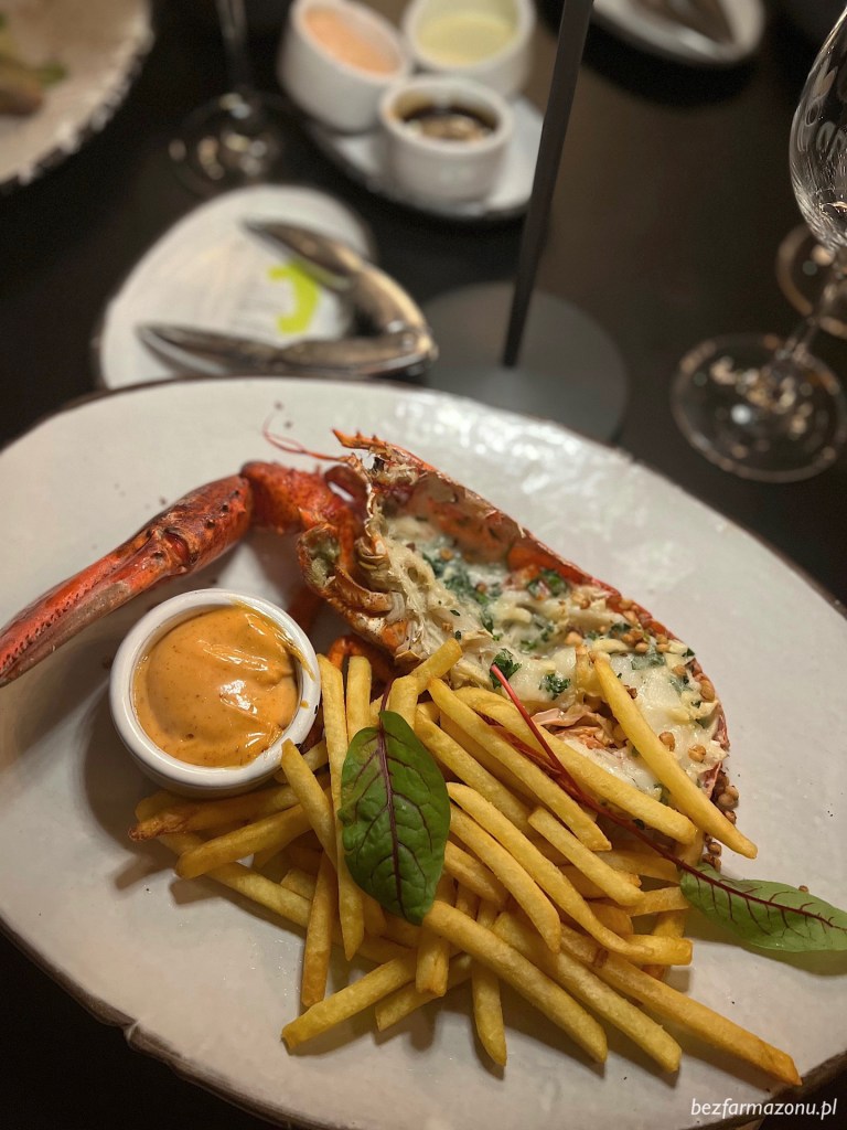 Połówka zapiekanego z masłem czosnkowym homara w zestawie z frytkami i sosem (189 PLN) z karty sezonowej prezentowała się jak poniżej. Kremowe mięso było miękkie, jednocześnie zwarte i przy tym delikatne. Jego subtelny smak dziarsko podbijała błoga, czosnkowo – pietruszkowa nuta. Najsmaczniejsze okazało się mięso znalezione w szczypcach oraz nóżkach. Aby się do niego dostać należy użyć specjalnych kombinerek – łamaczy oraz specyficznych, długich i cienkich widelco – szpikulców.