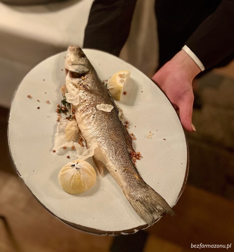 K. poprosił o basa morskiego (85 PLN) popularnie nazywanego u nas labraksem. Kelnerka zapytała o chęć oporządzenia ryby, a kolega bez wahania przystał na propozycję. Ku mojemu szczęściu przed ową operacją udało się rybiszczy zrobić zdjęcie.