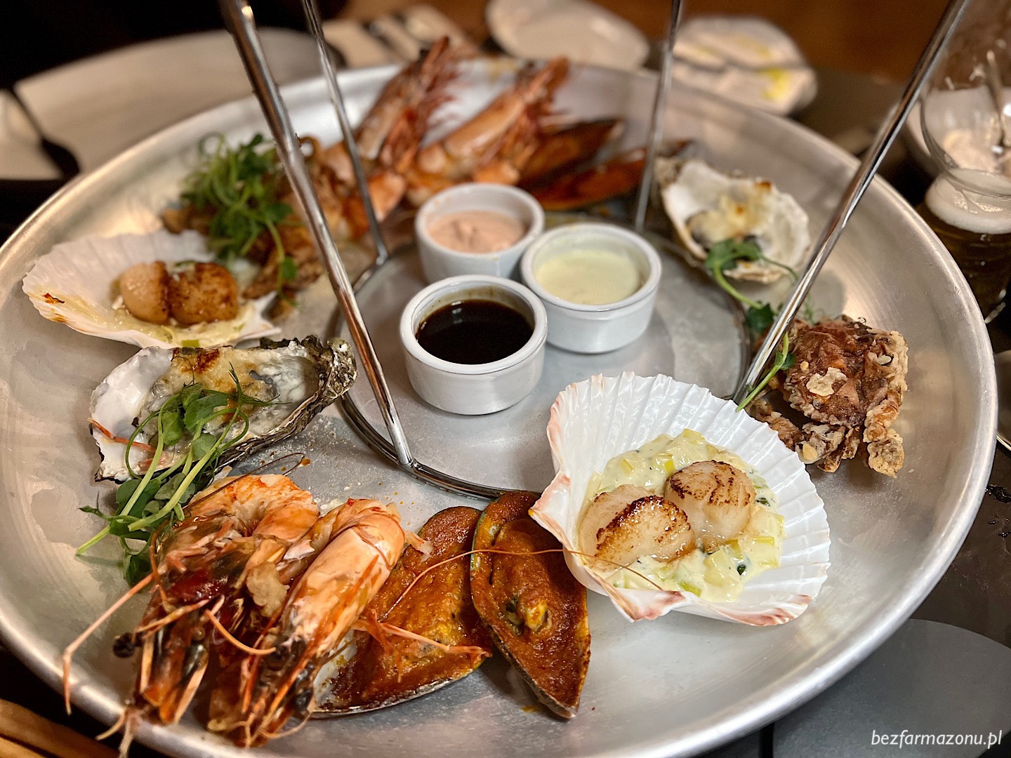 Pokład dolny to defilada przystawek ciepłych: małże nowozelandzkie, krewetki królewskie, muszle św. Jakuba, małe kraby i zapiekane ostrygi. Do owoców morza podano trzy, oczywiście przygotowywane od zera w restauracji sosy: różowy, tajski i teriyaki.