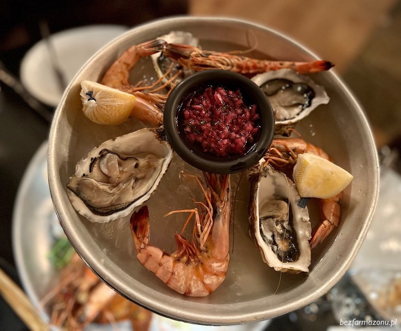 Na górnym pokładzie patery odnaleźliśmy spoczywające na lodzie ostrygi i krewetki wraz z lekką domową salsą oraz kawałkami cytryn (zwróćcie uwagę na ich zawinięcie w gazę – trick ma na celu wykropienie tylko i wyłącznie cytrusowego sosu – bez pestek i innych niepotrzebnych cząstek).