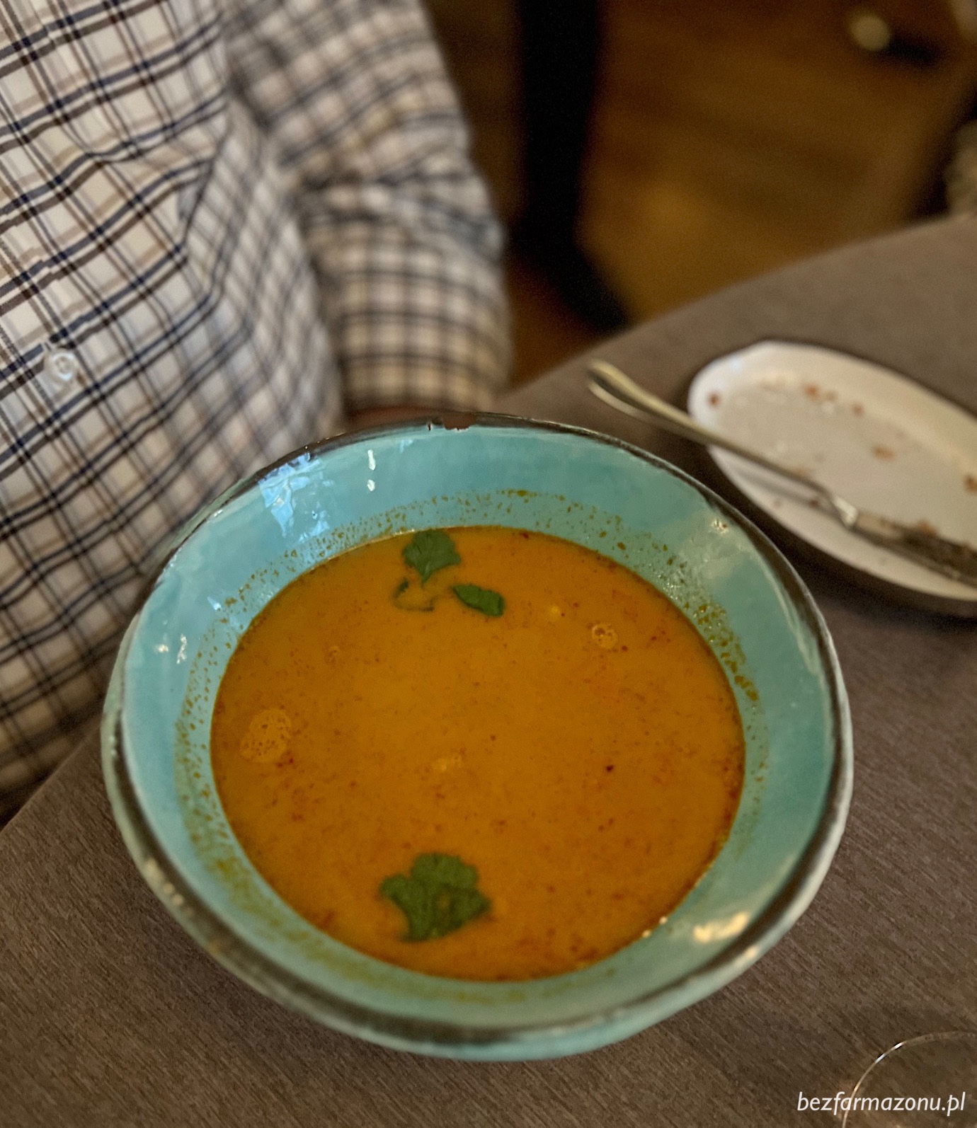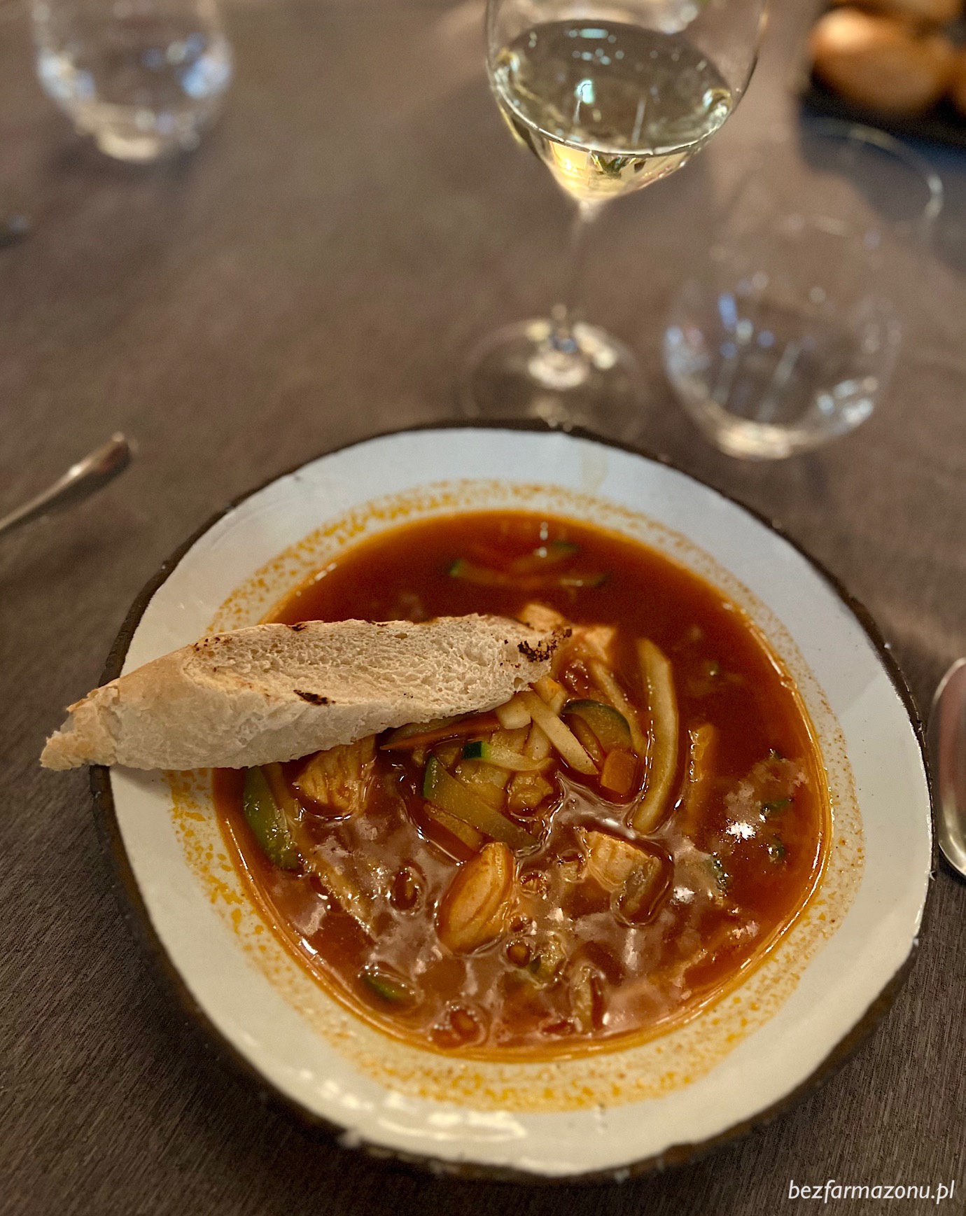 A. skusiła się na carpaccio z tuńczyka z sezamem, awokado, czerwoną cebulką, imbirem i oliwą (47 PLN), a my z kolegą B. poprosiliśmy o zupy: ostrą krabową oraz super treściwą śródziemnomorską z trzema rybami (każda po 38 PLN).