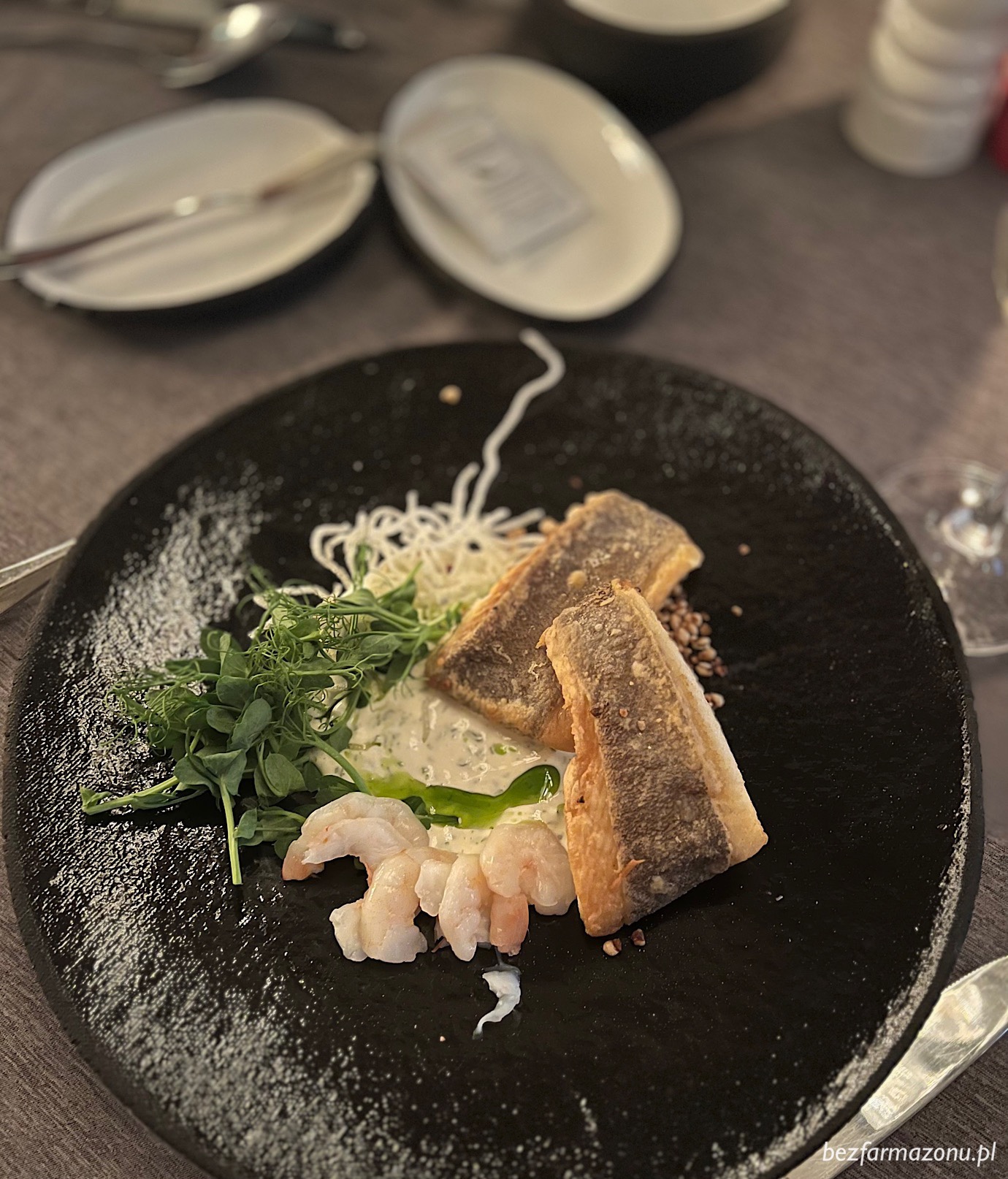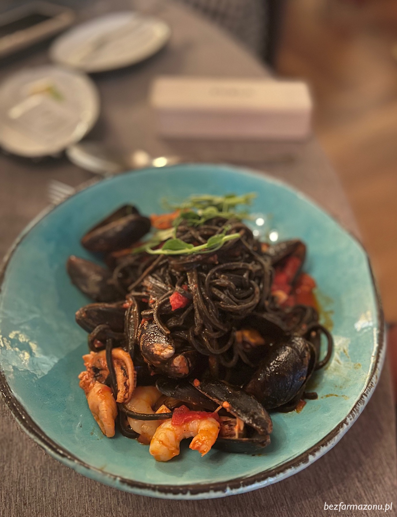 Szefu raczył się halibutem na zimnym sosie z krewetkami (69 PLN) do którego dobrał szpinak z czosnkiem i… rodzynkami (21 PLN). Kolega amerykanin oraz wspomniana wcześniej szwedzka księżniczka poprosili o czarne linguini z owocami morza (79 PLN). Kolega zjadł ze smakiem, A. zaznaczyła, ze makaronowi przydałaby się jeszcze chwilka w wodzie…