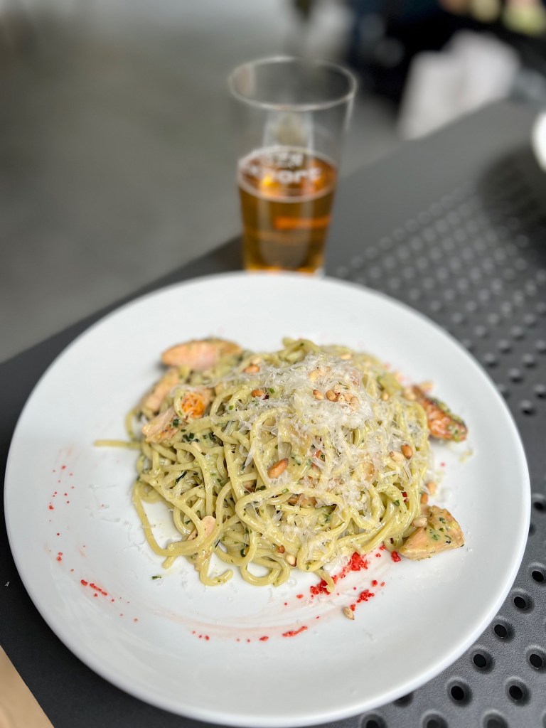 SPAGHETTI Z PSTRĄGIEM W KREMOWYM BAZYLIOWO – PIETRUSZKOWYM PESTO na winie i śmietanie, podawane z kawiorem ze śledzia (49 PLN) trochę ciężkie, ale smakowo bardzo wybitne.