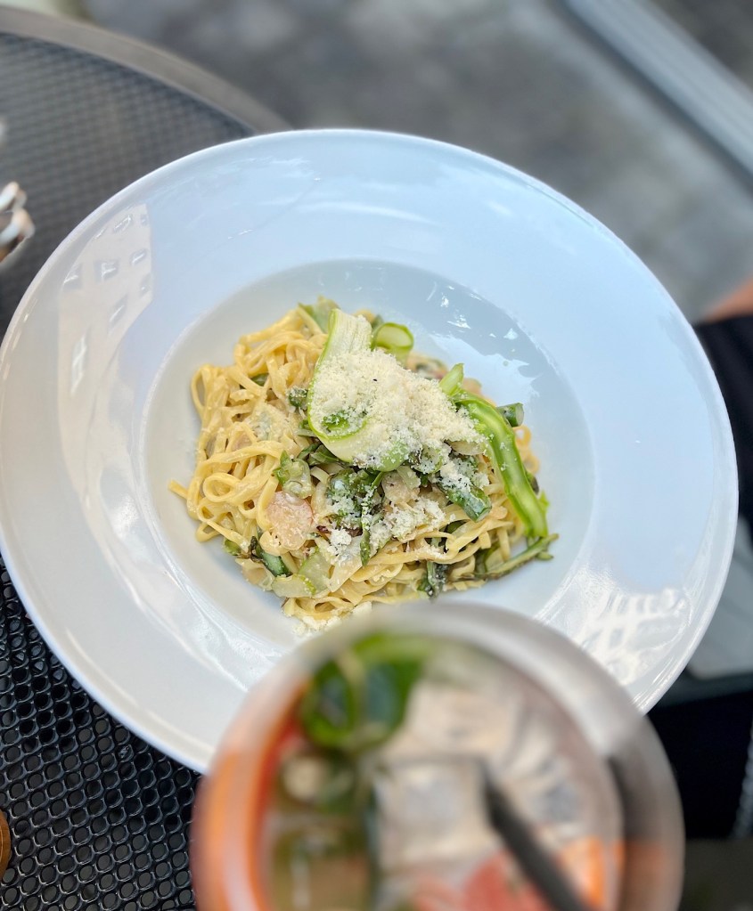 Oprócz standardowego menu oferowana jest również sezonowa wkładka, a w niej takie oto wyborne FETTUCCINE ZE SZPARAGAMI na winie, z czosnkiem i crema di gorgonzola (39 PLN).