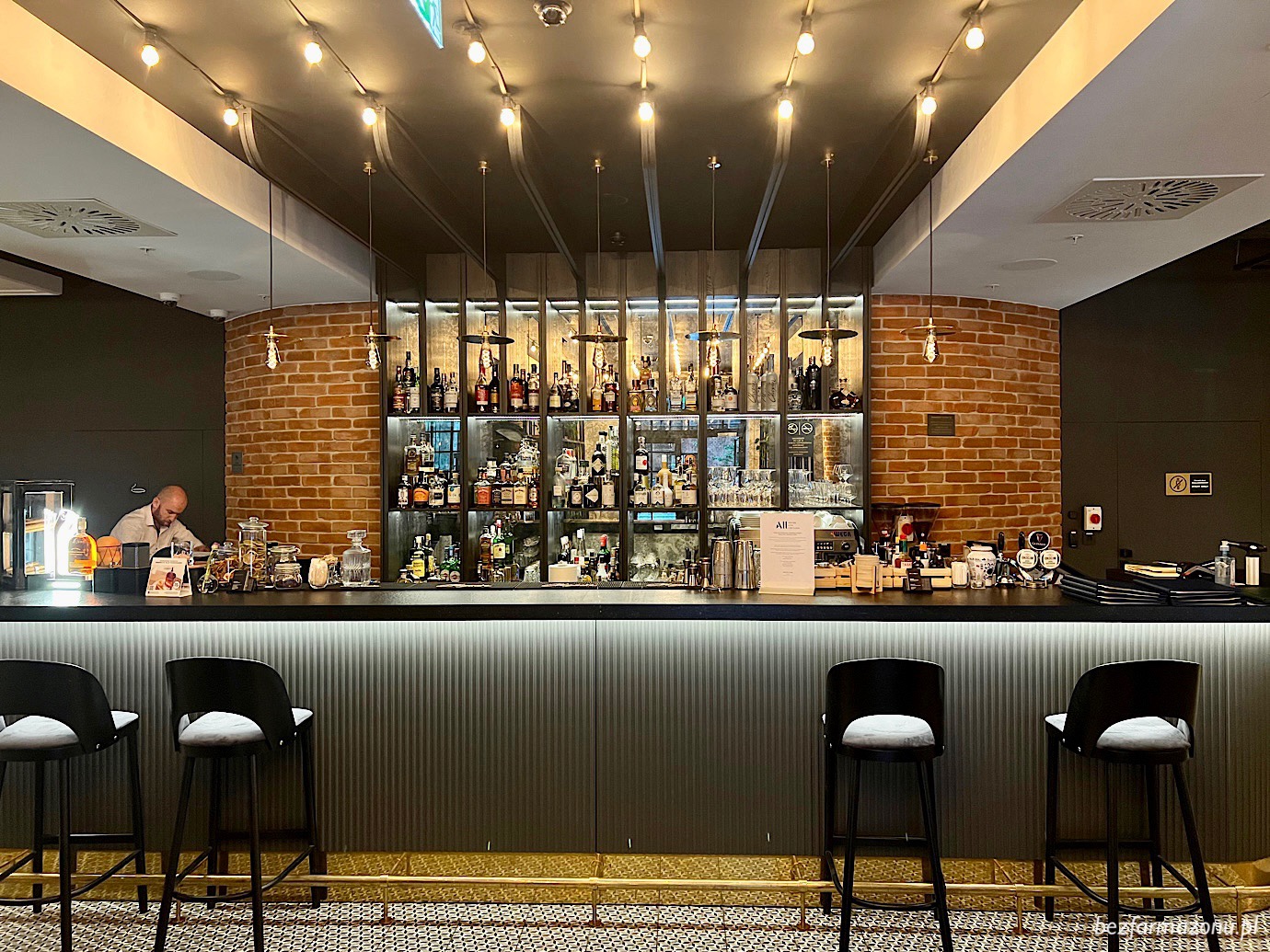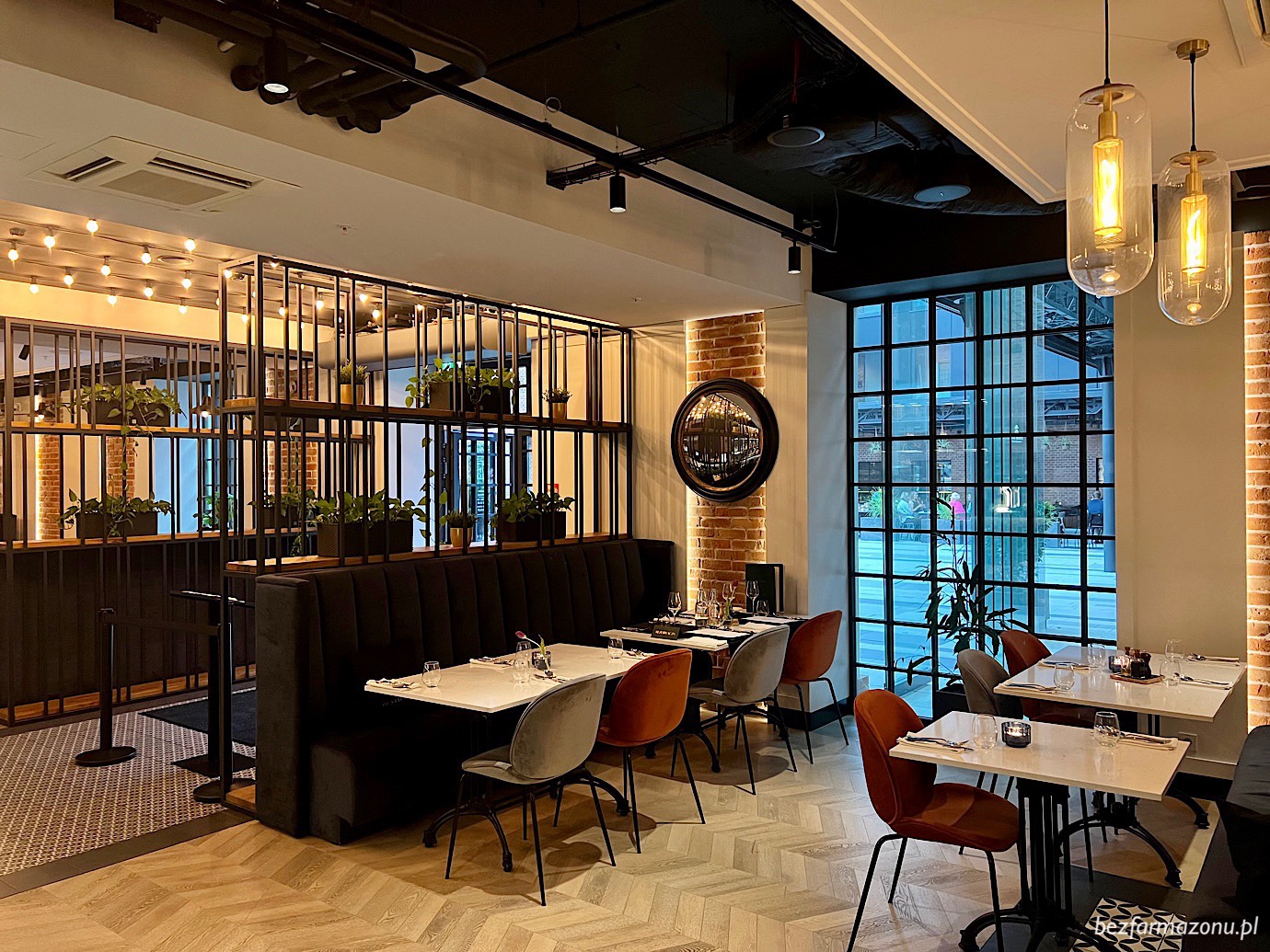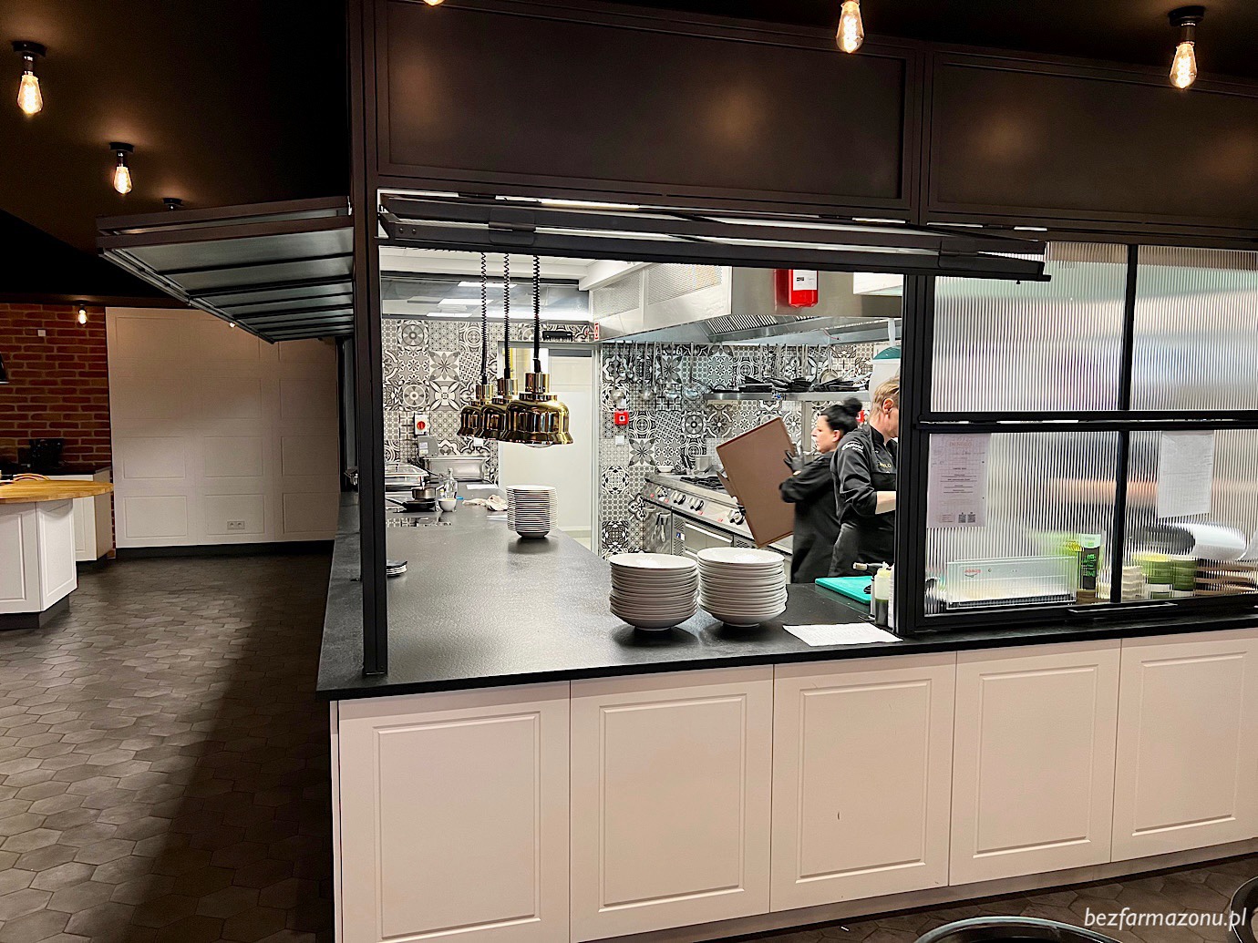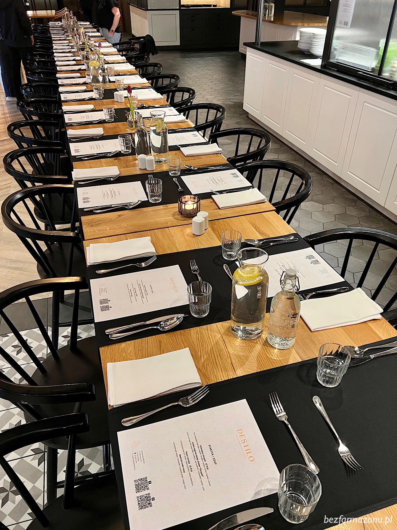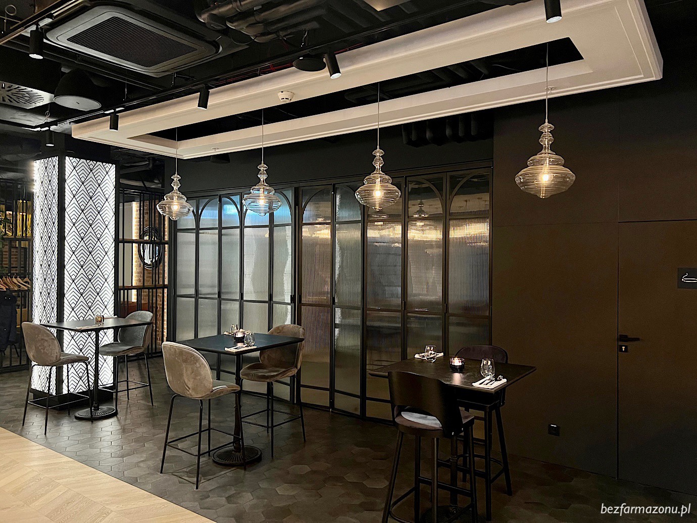 Czerwiec 2023. Restauracja Hotelu Mercure****. Kompleks Fabryczna 13. Kolacja firmowa. Rezerwacja na trzydzieści osób przy stolikach ułożonych wzdłuż otwartej kuchni.