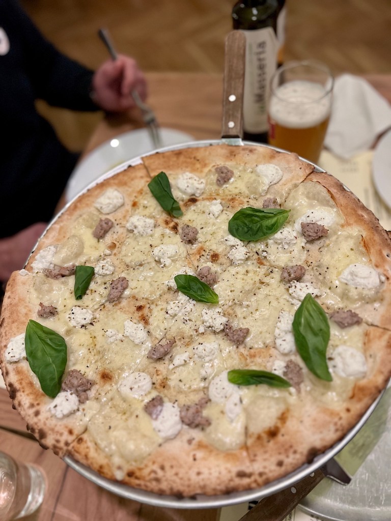 Poniżej widzicie Biancę z 2x mozzą, ricottą i pecorino (29 PLN) do której dobraliśmy włoską kiełbasę i czosnek (12 PLN). Fajna, smaczna, lecz kurcze za sucha.