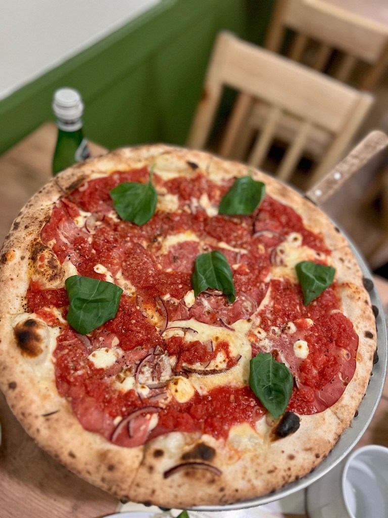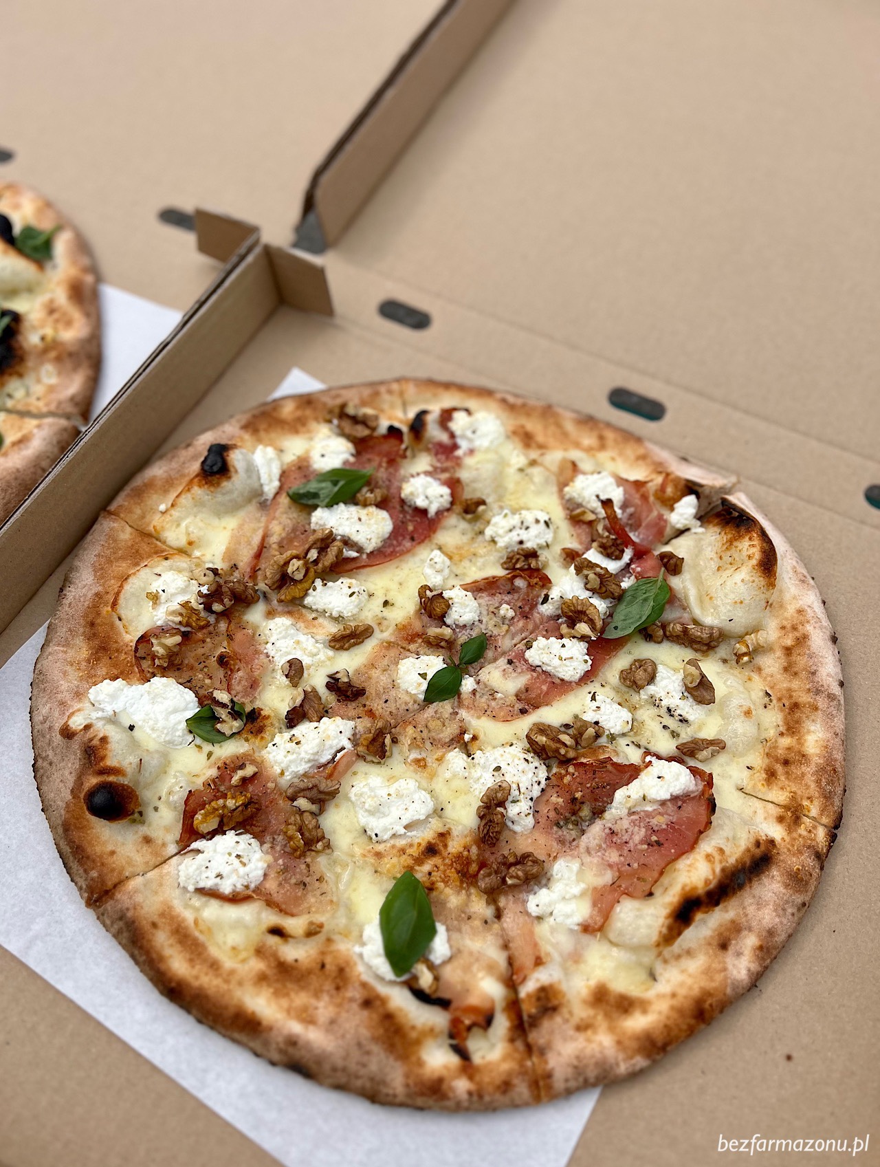 Z karty wybraliśmy także piękność z breasolą, czerowną cebulą i fetą (45 PLN). Mokra, przyjemna, ale według nas tak dobra szynka jak bresaola powinna być wrzucona na pizzę na koniec na surowo, a nie być zapieczona pod sosem, gdyż po prostu traci aromat.