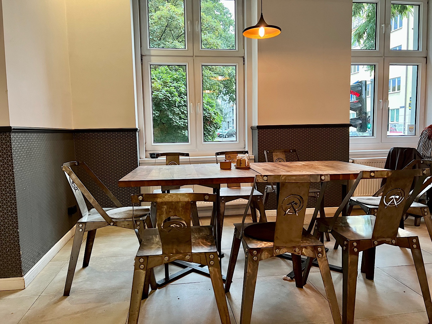 Co do wystroju to nazwałbym go hmm… dziwnym. Krzesła, które są inne niż wszystkie, ale mają tak pochylone oparcie, iż nie da się na nich wygodnie oprzeć… Ściany albo łyse, albo na jednej jakieś talerze i kubki, a na innej metalowa instalacja z zębatkami. Jeśli miało być surowo, to się udało.