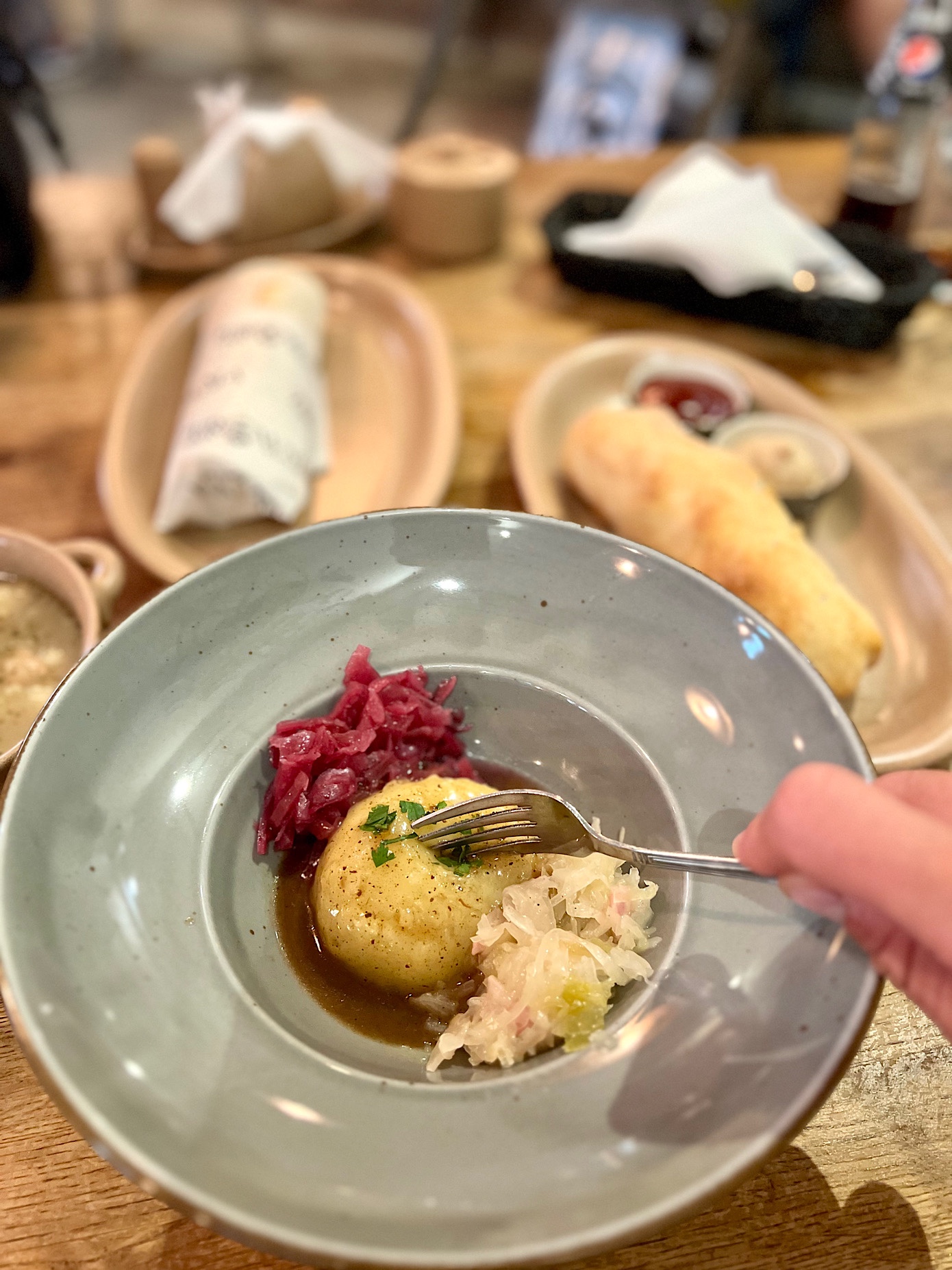 W środku super miękkiego i kleistego ciasta schowano szarpaną wołowinę dosmaczoną kiszonym oraz cebulą i boczkiem. Dookoła rzeczonej kuli zasmażana oraz modro kapusta. A wszystko spoczywające na pieczeniowym sosie. Dla mnie bomba.