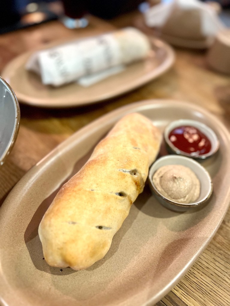 Bez dwóch zdań czymś naprawdę interesującym była przepyszna domowa kiełbasa śląska z boczkiem, pieczarkami, żółtym serem i cebulą (38 PLN) otulona ciastem na żurowym zakwasie. Obok dwie miseczki: łagodna musztarda i okrutnie słodki ketchup.