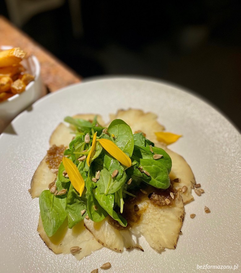 Jak nie cierpię selera, tak w formie carpaccio mógłbym go jeść codziennie. Na znienawidzonym kiedyś, pieczoym warzywie spoczywało pesto słonecznikowe z nutą truflowej oliwy. Na wierzchu sałatka ze szpinaku (24 PLN). To danie to vege niespodzianka level pro.