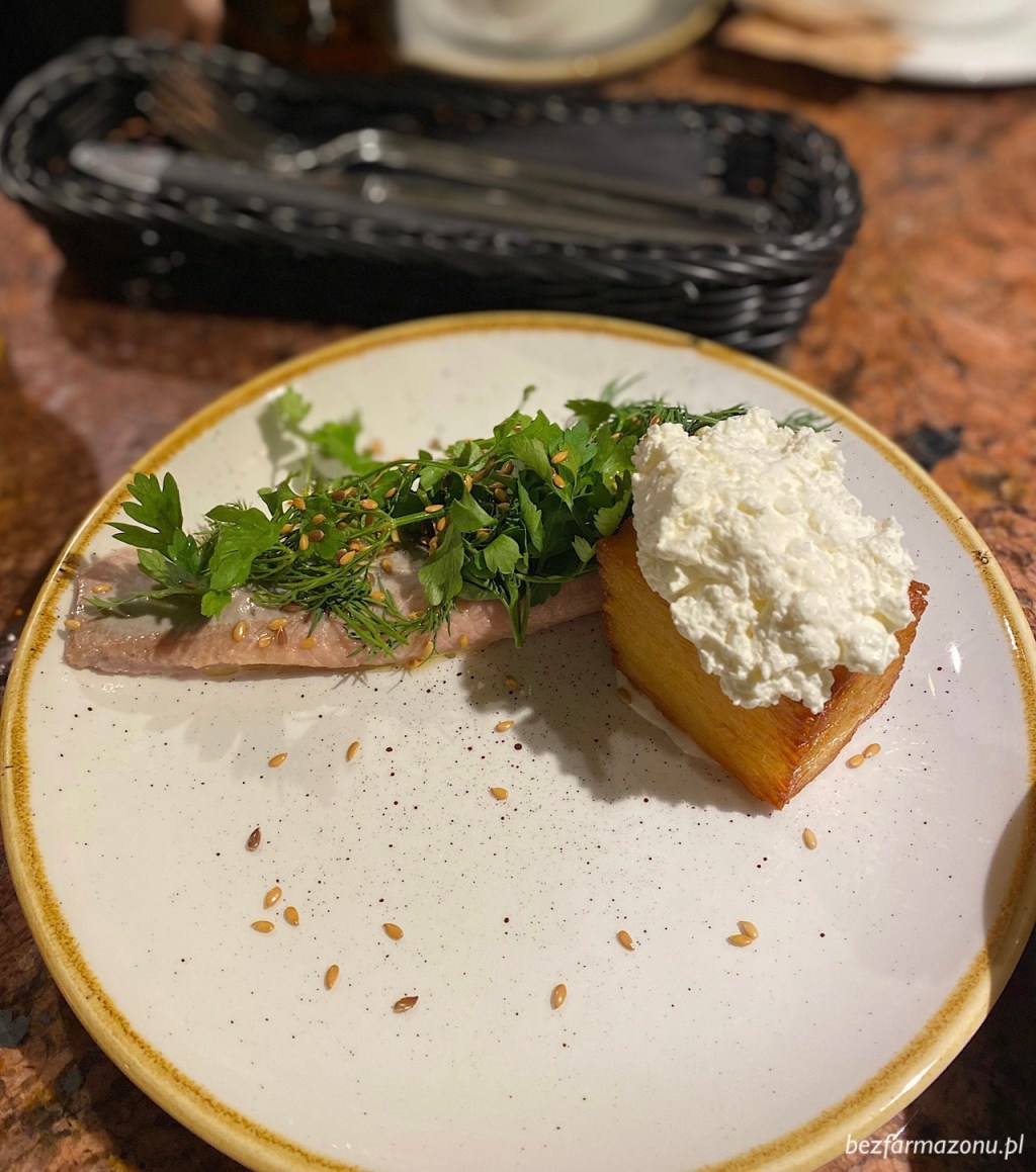 Z sekcji talerzyków na stole wylądowały dwie pozycje. Łagodny i aksamitnie miękki, nieprzesolony podwędzany matias holedarski, ziemniak w formie gratin, przepyszny gzik oraz len z ziołami (29 PLN). Komfortowy i elegancki talerz.