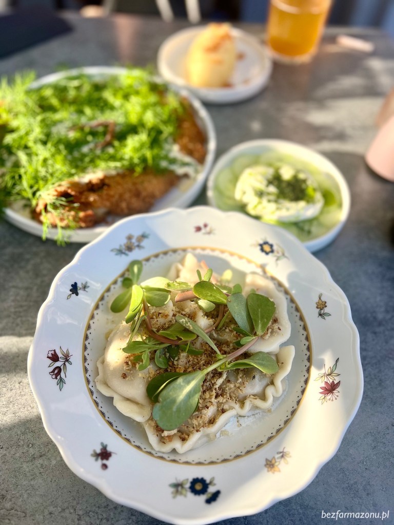 Pierogi z wieprzowiną, fasolą i czombrem, kruszonką (58 PLN) oraz ciekawym ziółkiem, które jadłem po raz pierwszy – portulaką – pomysłowe, niesztampowe, dobre. Po prostu dobre.