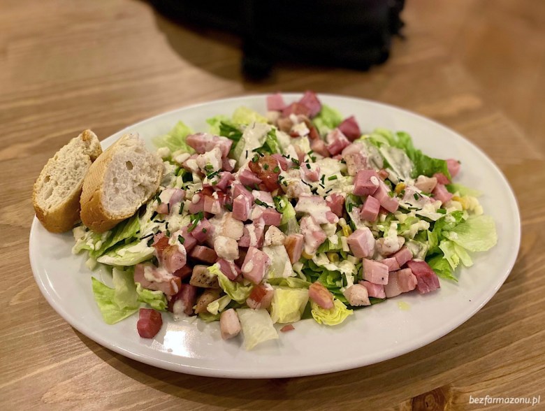 Krojona w kawałki szynka i boczek wraz ze smażonym kurczakiem podanym na świeżej lodowej sałacie z odrobiną kukurydzy, sosu czosnkowego, szczypiorku oraz żółtego sera nie jest szczytem kulinarnych możliwości. Słabe pieczywo nie ratuje sytuacji. Jakim więc cudem wyzerowałem talerz? Nie wiem, smakowało to tak prosto i jednocześnie świeżo. Postanowiłem, że wrócę i następnym razem wezmę coś na ciepło.