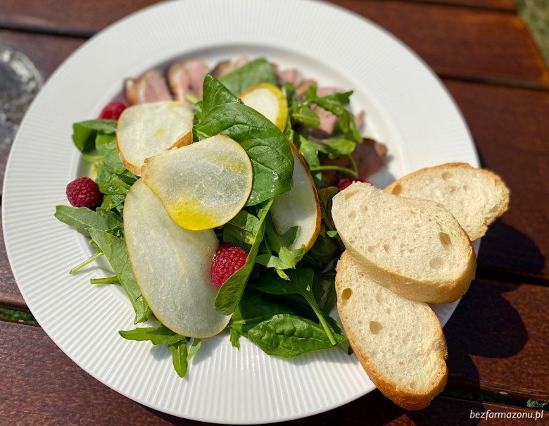 Na sam koniec opowieści trafia sałatka z kaczką (27 PLN) której brakowało pazura. Marynowana kaczka rzeczywiście smakowita, ale jej raptem pięć cieniutkich plastrów nie jest w stanie posilić kobiety, a co dopiero faceta. Cztery kawałki gruszki i kilka malin z winegretem na szpinaku i rukoli w towarzystwie nie oszukujmy się słabego sklepowego pieczywa nie jest tym co tygryski lubią najbardziej.