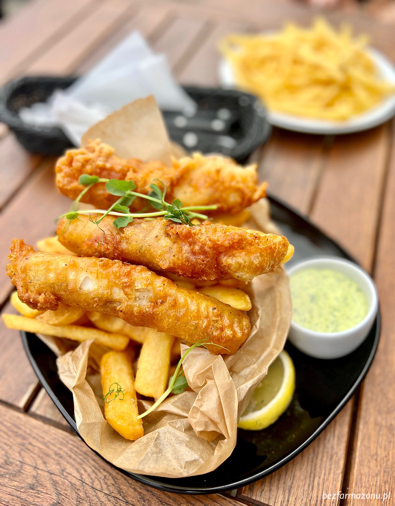 Trzy kawałki dorsza w pozycji fish & chips (42 PLN) sprężyste, nietłuste i arcychrupiące, stekowe frytki bardzo w porządku. Ziołowy majonez jednym posmakuje, a innym nie. Wciąż brakuje mi tu świeżości: zielonego groszku w formie puree, albo chociaż świeżej surówki. Tak czy siak w cenie lekko ponad 4 dyszki jest to godna pozycja w karcie.