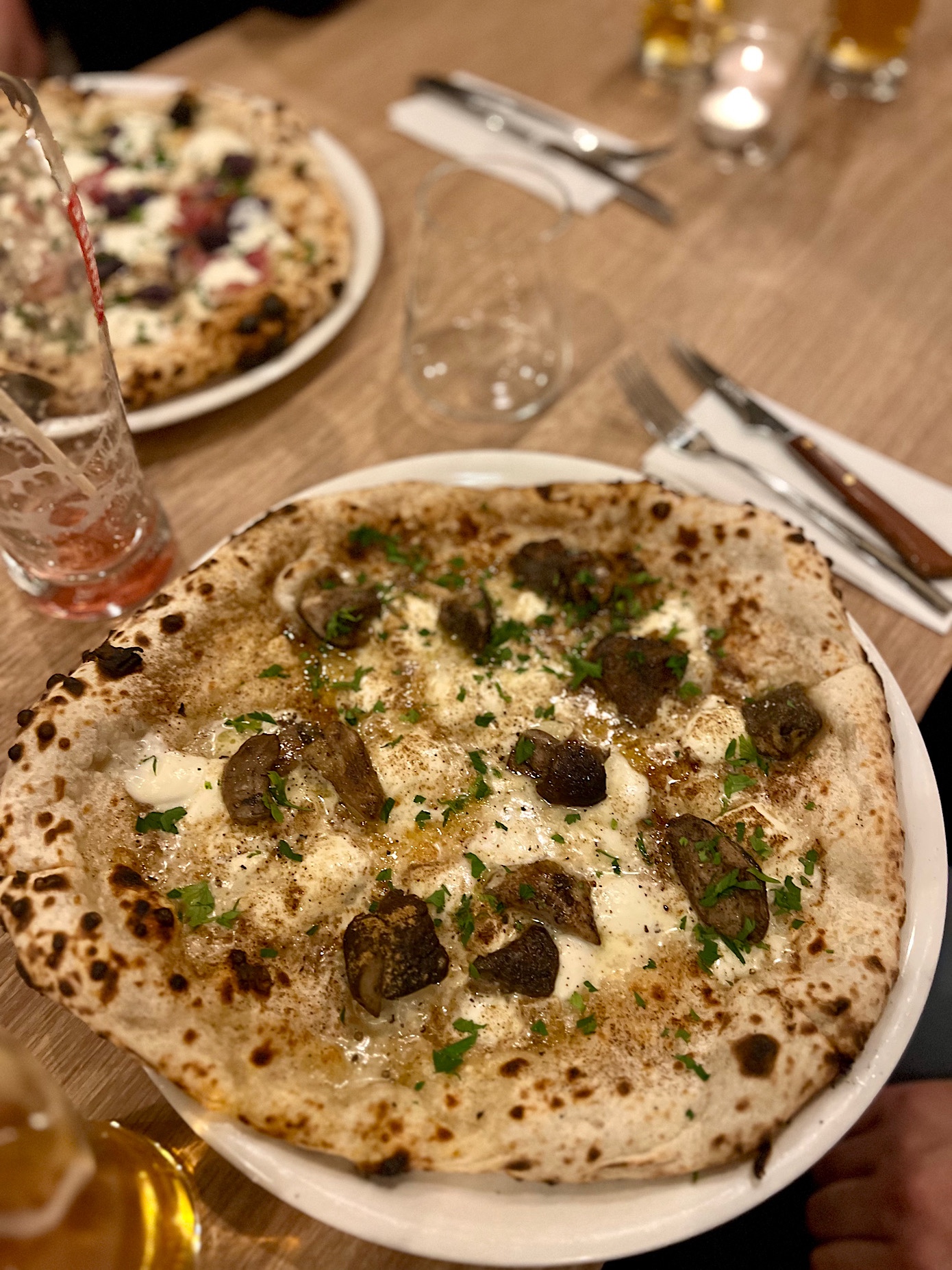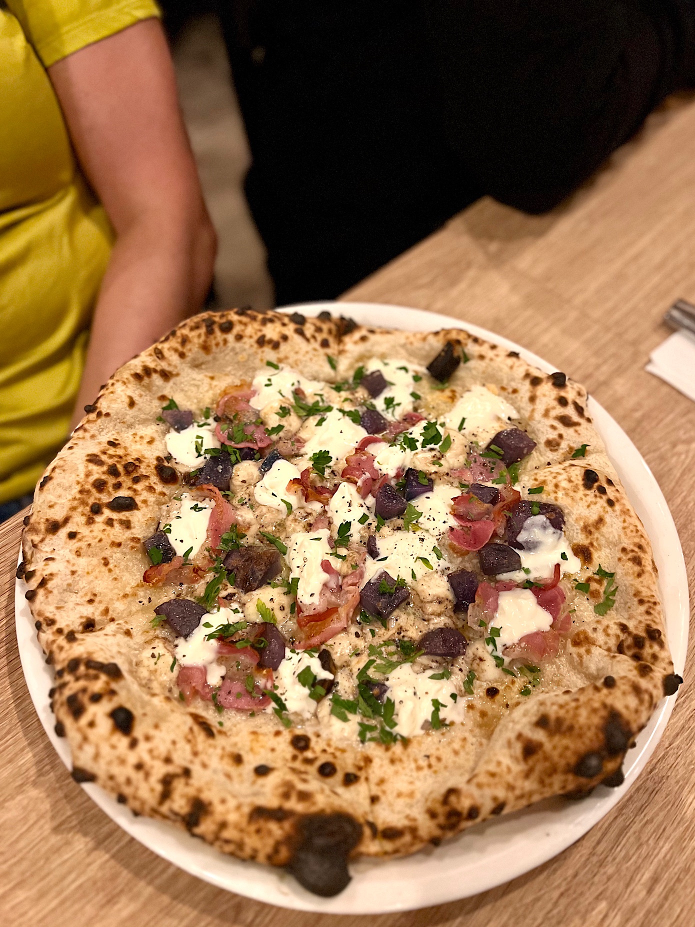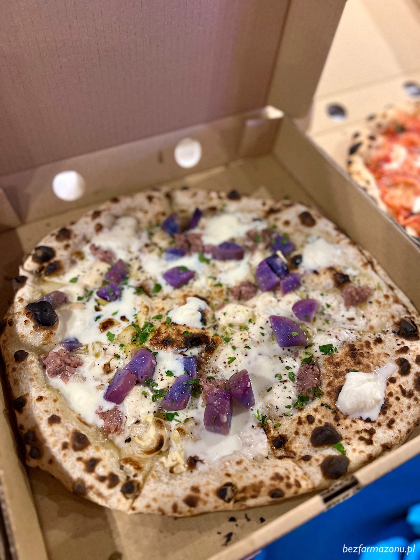 Salsiccia (43 PLN) – wędzona mozzarella Fior di Latte, aromatyczna salsiccia, creme fraiche, parmezan, ziemniaki truflowe, świeża pietruszka.