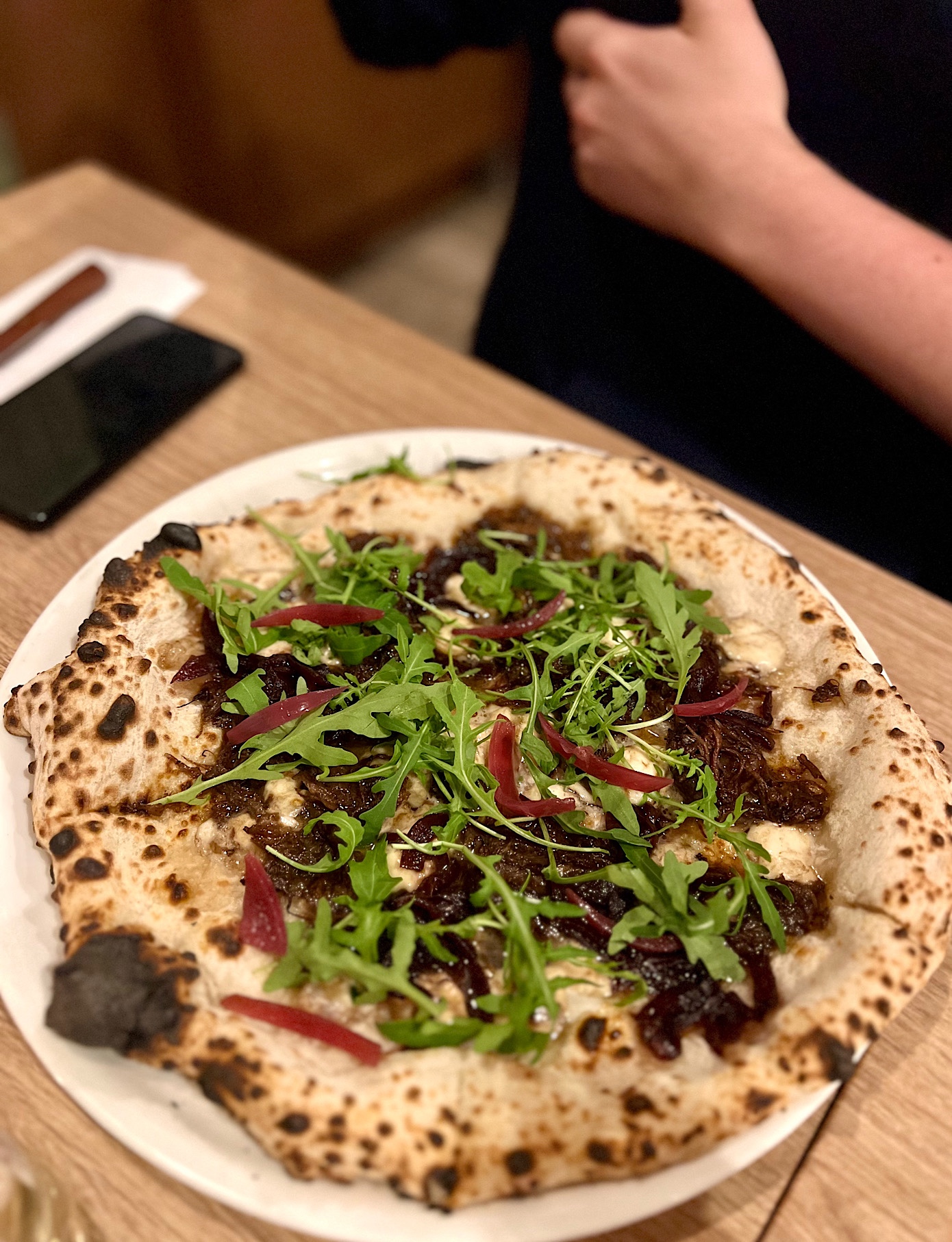 Sezonowa Asparagi (41 PLN) – kremowy crème fraîche, delikatna wędzona mozzarela Fior di Latte, zielone szparagi, chipsy z jarmużu, pieprz.