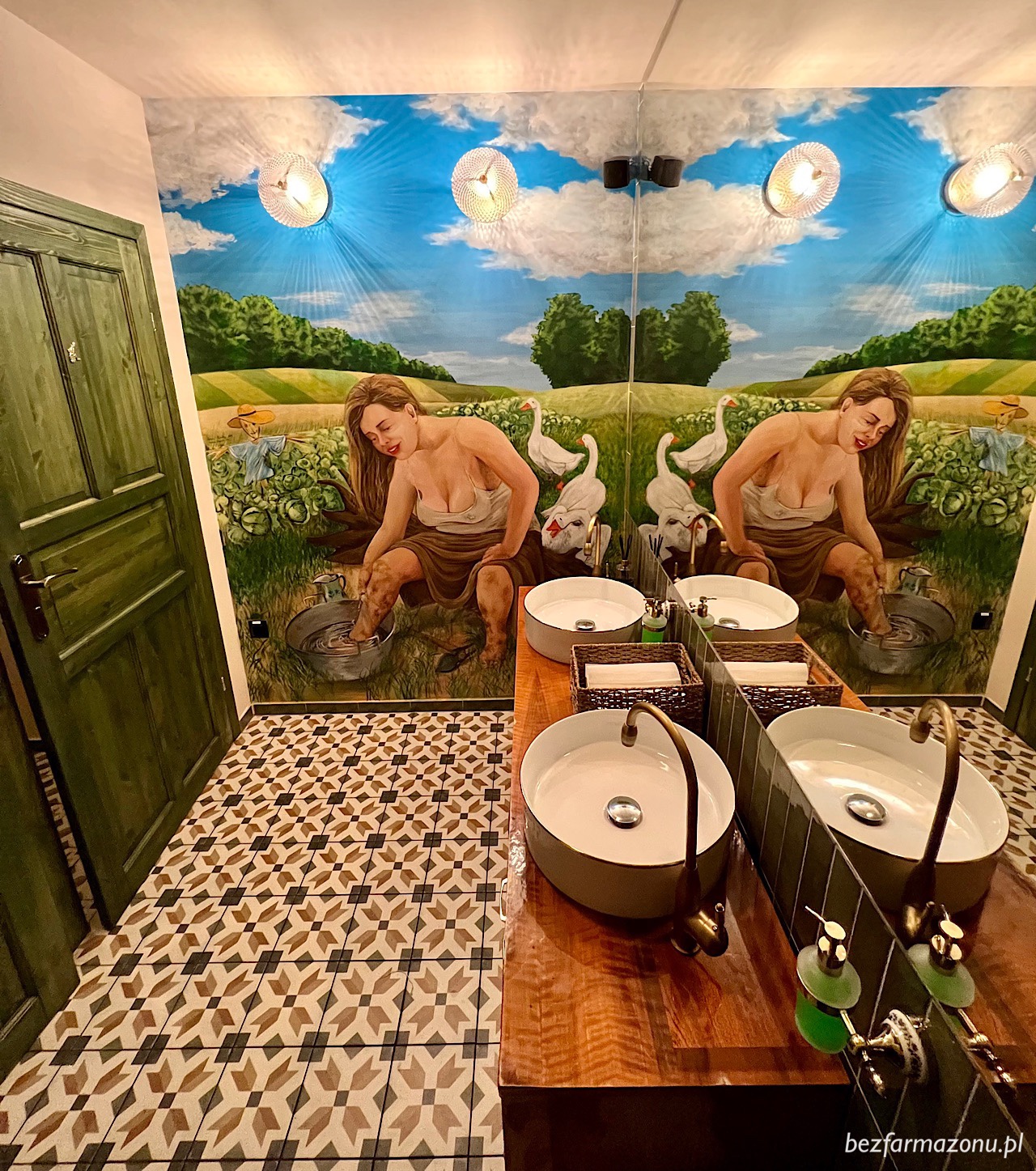 Na początek kilka słów o wystroju w który włożono sporo serca. Czy widzieliście gdzieś w Kraku taką łazienkę? I nie chodzi tylko o malowidło. Spójrzcie na płytki, krany, drzwi, lampy…