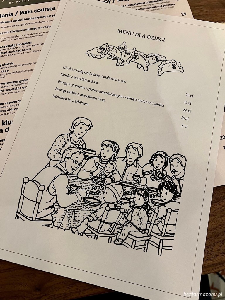 Dzieciaczki mogą liczyć na oddzielne menu. Co prawda nie ma wydzielonego kącika zabaw, ale przy stole mogą pokolorować swój jadłospis.