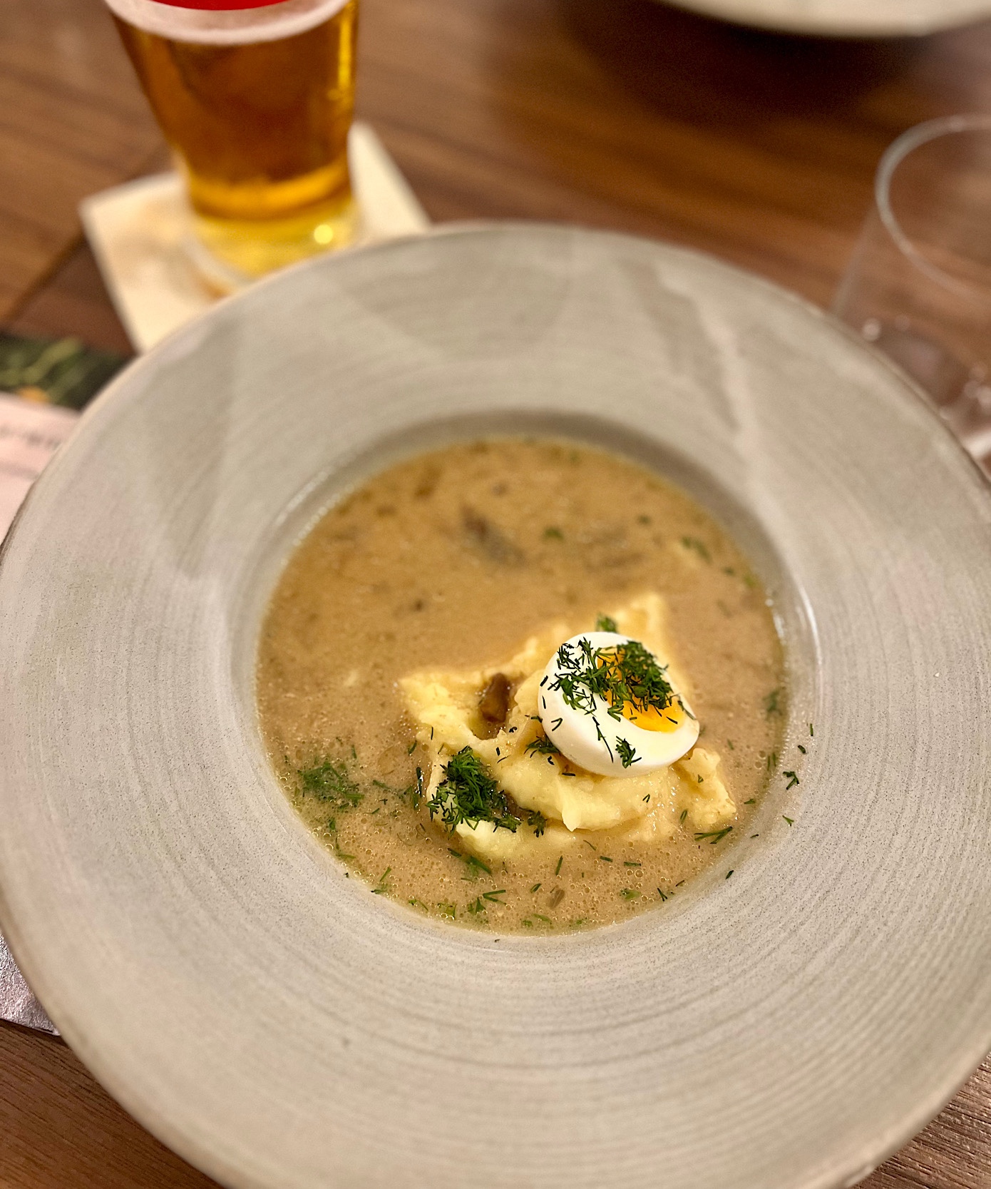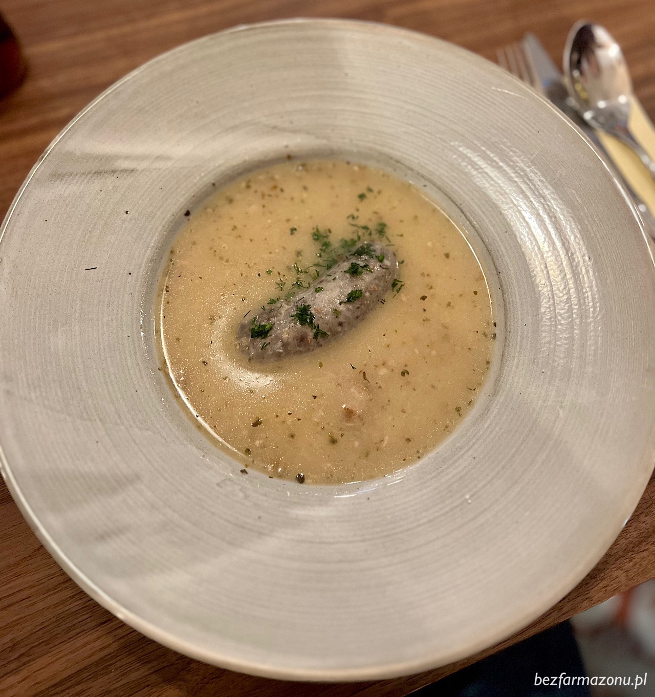 Żurek na wędzonce z ziemniakami i białą kiełbasą (26 PLN) pamiętałem bardzo dobrze, bo niegdyś kupił mnie treścią i gęstością. Tym razem owej treści nie było tak wiele – raptem jeden ziemniaczek i dosłownie kilka sztuk bardzo drobnego mięsa z wędzonych. Biała kiełbasa wraz z przesmaczną cieczą, tak jak kiedyś rozpromieniła lica wszystkich testujących.