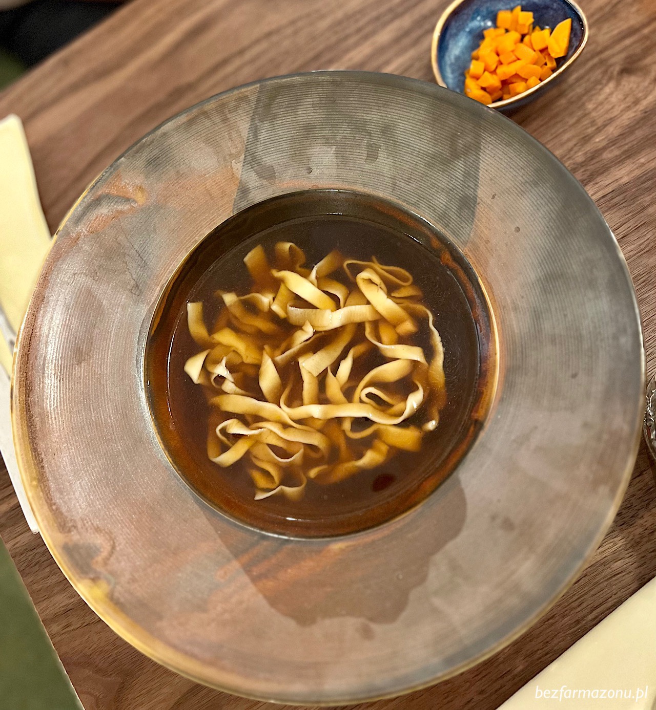 Rosół bardzo, ale to bardzo esencjonalny, pieprzny i nad wyraz ciemny (prawdopodobnie przez paloną cebulę) dzieciaczki dostaną z podaną obok marchewką oraz bez zbędnej zieleniny. Nie jest to delikatny rosołek drobiowy, więc szczerze informuję iż mniejsze pociechy mogą kręcić nosem… Tak było w naszym przypadku, dorośli jednak ocenili na plus.