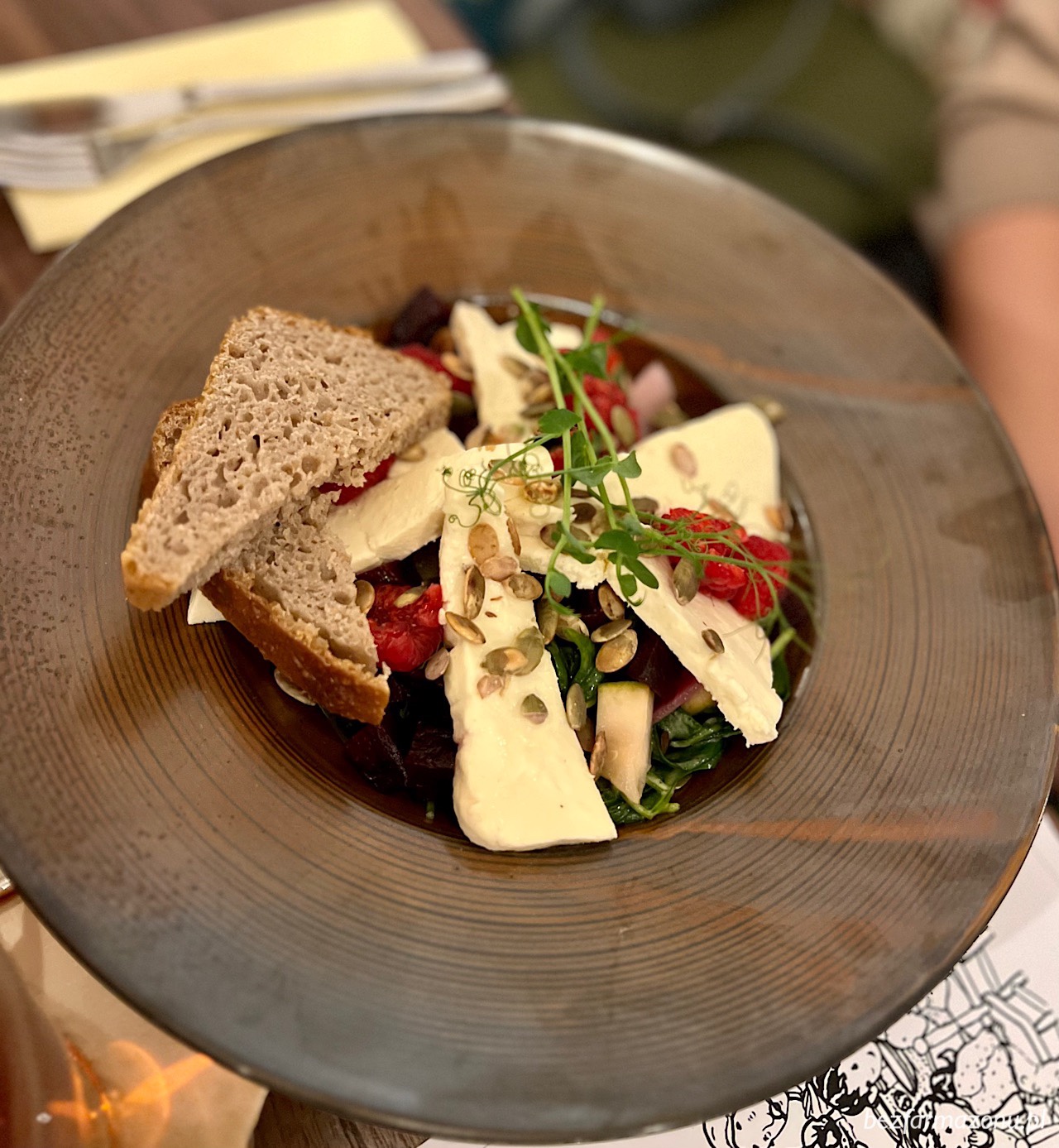 Sałatka z bundzem, pieczonymi burakami, warzywami, pestkami dyni i pieczywem (42 PLN) w menu nosi oznaczenie nie nudnej. Z tym stwierdzeniem się jednak nie zgodziliśmy. Bo powiedzmy sobie szczerze – trzeba mieć odwagę, aby nie epatującego nadzwyczajnym smakiem bundza dać jako główny składnik. Sałatka nie była zła, ale sorry – mdła i nudna. Plus za chleb na zakwasie – ten owszem wybijał się smakiem.