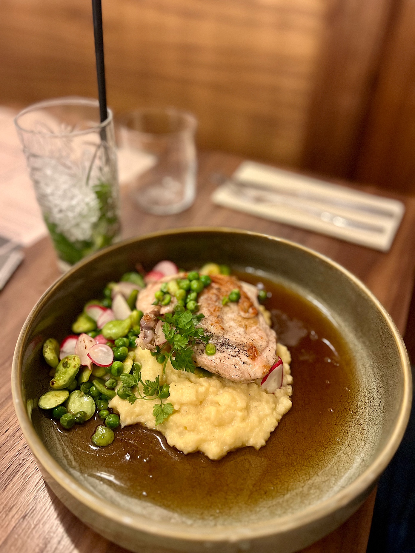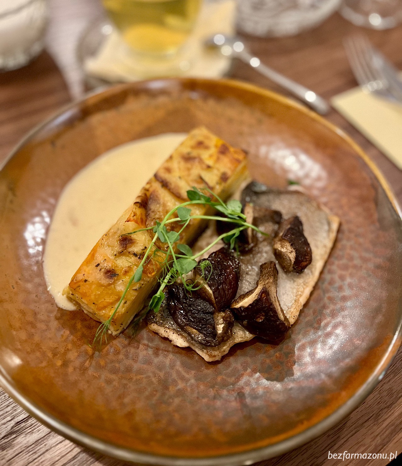 Filet z pstrąga z wyśmienitym ziemniaczanym gratin, grzybami oraz wybitnym, gęstym sosem z kiszonej kapusty (49 PLN) poleca się tym którzy lubią łączyć bardzo delikatne rybne nuty z mocnym aromatem kapuchy. Samo gratin było jednym z najlepszych jakie dotychczas jadłem.