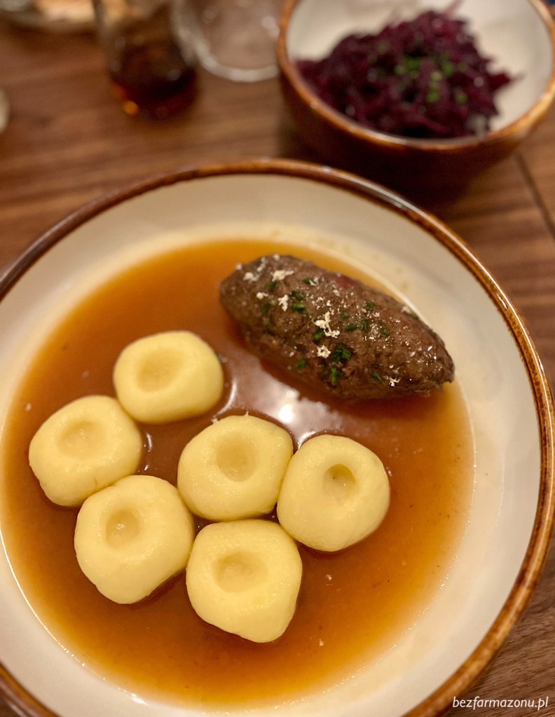 Rolada z kluskami śląskimi (49 PLN) to ich wizytówka. Sos pieczeniowy okazał się niestety stanowczo zbyt rzadki i bez obiecanego w menu chrzanu (chwilę później dowiedziałem się, że to jednorazowa pomyłka i że zawsze jest jednak gęsty). A wołowina? Fenomenalna! Idealnie przyprawiona i przygotowana w punkt w środku z boczkiem, kapustą i cebulką. Modro kapucha wtórowała jej bez faulu.