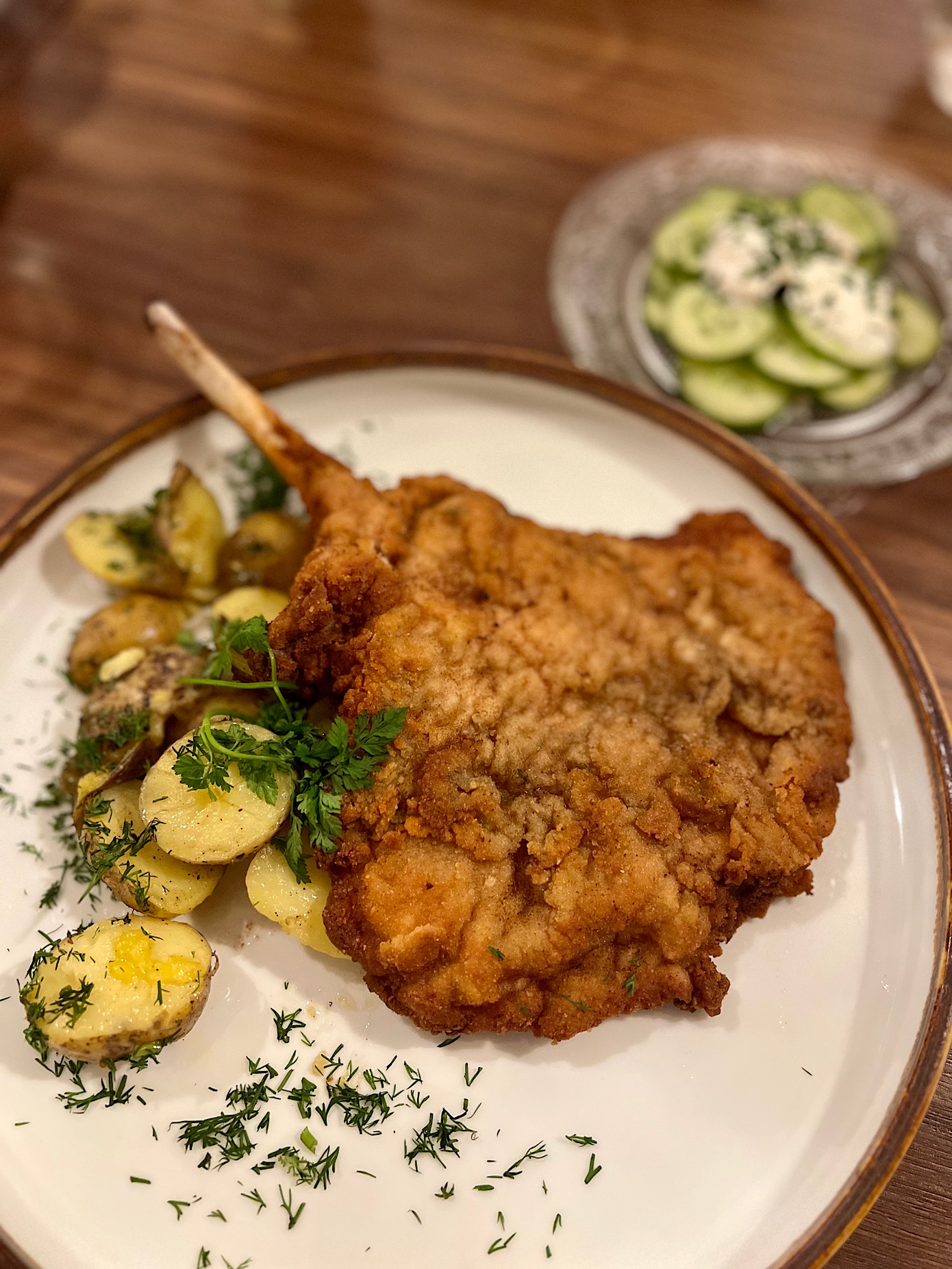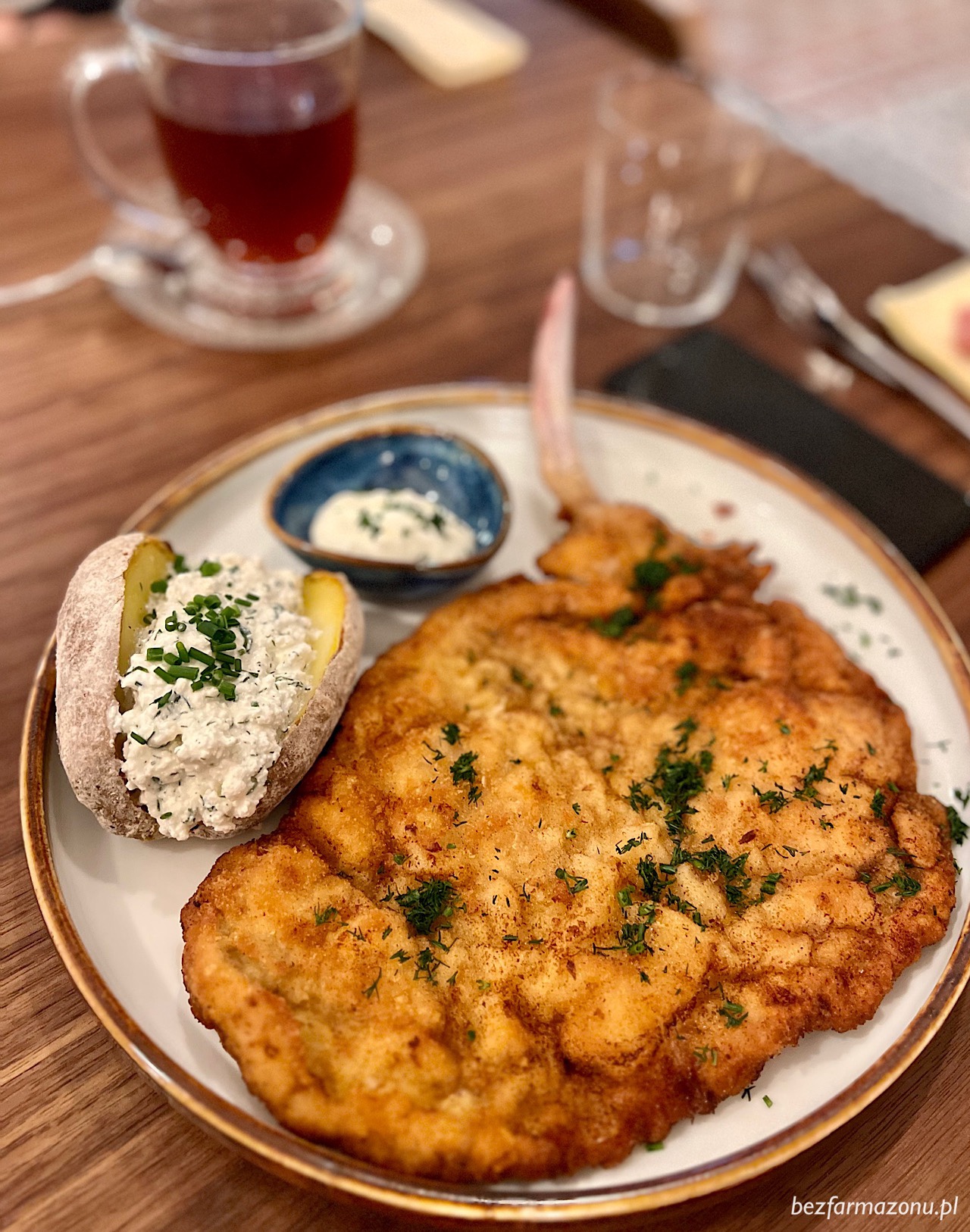 Kotlet schabowy z kością (46 PLN) w każdym calu perfekto – mięso odpowiednio przyprawione, panierka świeża, chrupiąca i nie ociekająca smalcem.