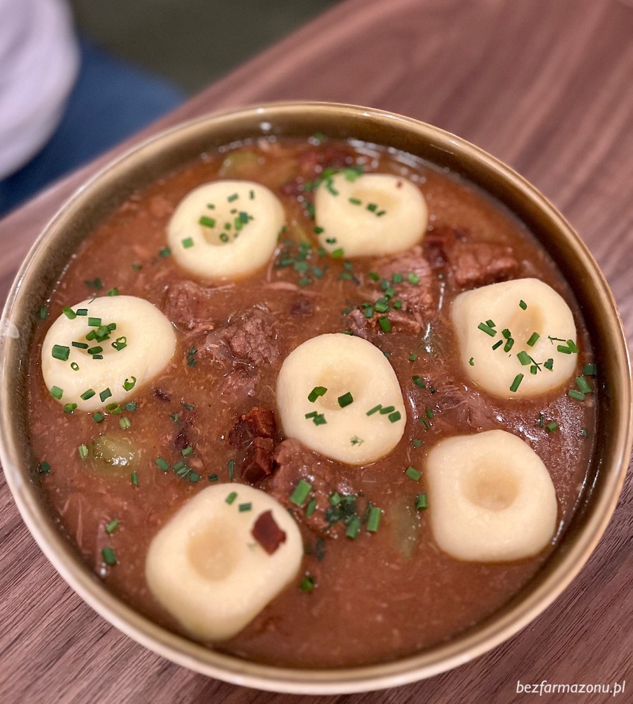 Kluski z gulaszem wołowym ze skwarkami z pikantnej kiełbasy (39 PLN) również niczego sobie. Gęsty sos z mięciutkim mięchem radował szwagra, który owo danie wciągnął chybcikiem.