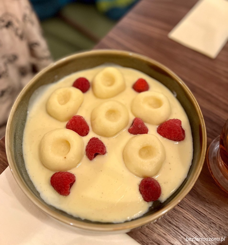 Kluski śląskie z sosem z białej czekolady o konsystencji budyniu oraz malinami (29 PLN) wybrał dla siebie konsument najmłodszy wiekiem. Tutaj ciężko mi szczerze ocenić, gdyż bardzo rzadko jadam dania na słodko. K. coś tam spałaszował i mówił, że okey, ale od konkretniejszego komentarza się wstrzymam.