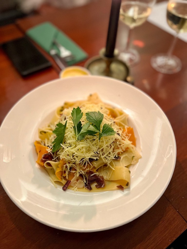 Przed S. pojawił się makaron pappardelle z dojrzewającą wołowiną, warzywami i serem bursztyn (65 PLN). Pastę ugotowano w punkt, suszona wołowina również została przygotowana bardzo dobrze. Wszystkie smaki świetnie ze sobą współgrały.