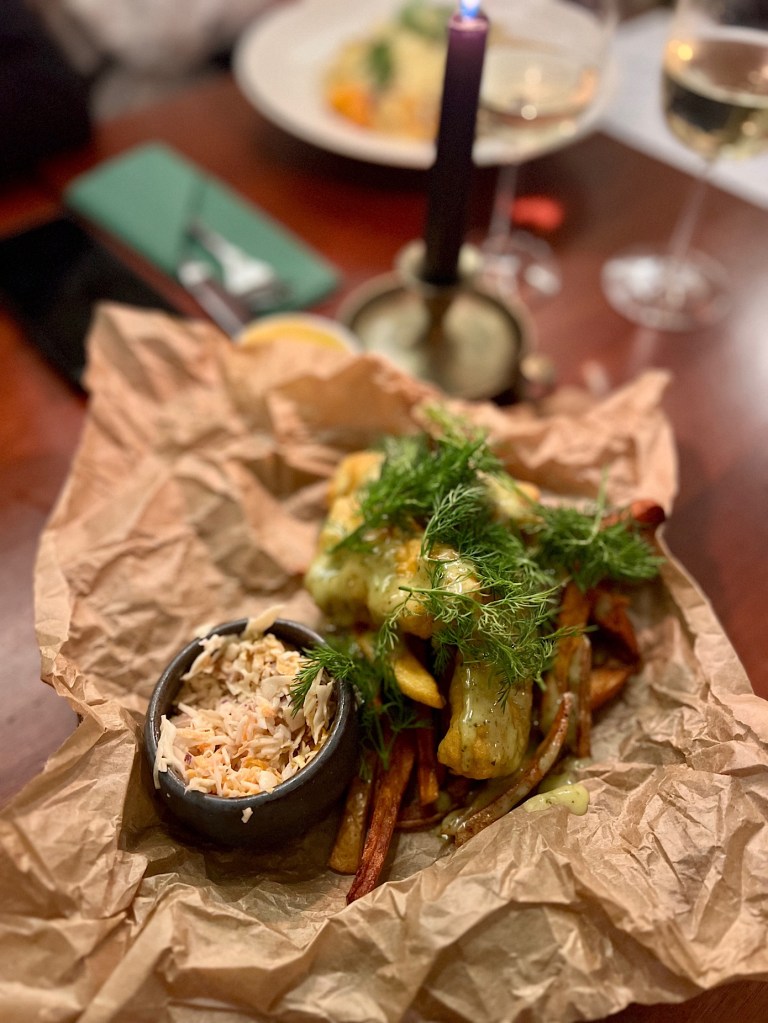 K. zdecydowała się na fish and chips, czyli dorsza w cieście na ich własnym piwie Baster, grubo krojone frytki, colesław i ziołowy winegret (48 PLN). Sam filet bardzo w porządku jednak szkoda, że całość polano sosem, bo panierka nie była tak jak lubię chrupiąca – wolałbym ten sos obok w dodatkowym pojemniku. Frytki – grube i miękkie – ja takie uwielbiam, ale wiem, ze fani chrupiących będą kręcić nosem.