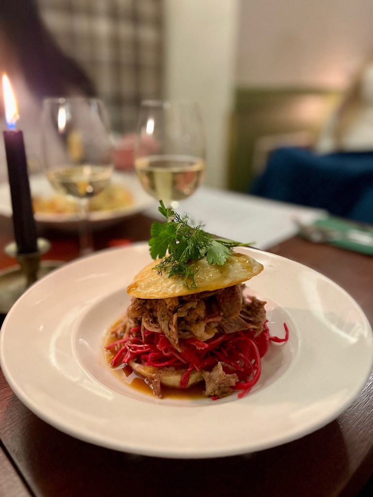 Na start zamówiliśmy karafkę niezłego białego wina domu, a także deskę wędlin i polskich serów dojrzewających, którym towarzyszył domowy pasztet, smalec, domowe wędliny, podpłomyk, paluchy drożdżowe, pieczywo, pasta z fasoli, sos pomidorowy, pasta dyniowa i pikle (75 PLN).