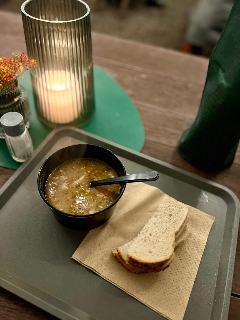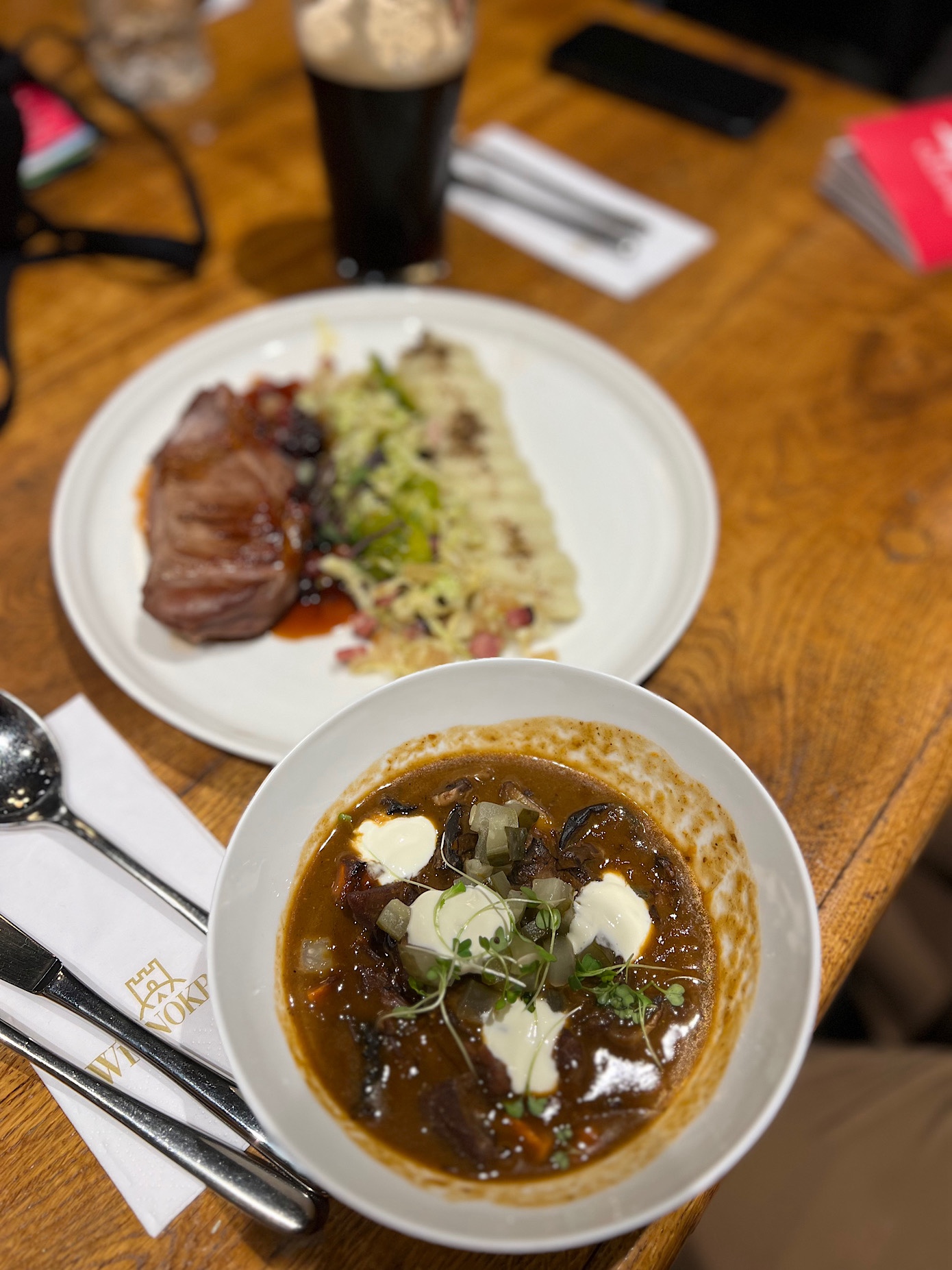 Zjadłem tu chyba najlepsze na świecie flaczki na gęsich szyjkach z boczniakami (26 PLN). Kolega pałaszował bigos z gęsiną, lokalnymi mięsami, suszonymi grzybami i nutą sandomierskich śliwkowych powideł (27 PLN).