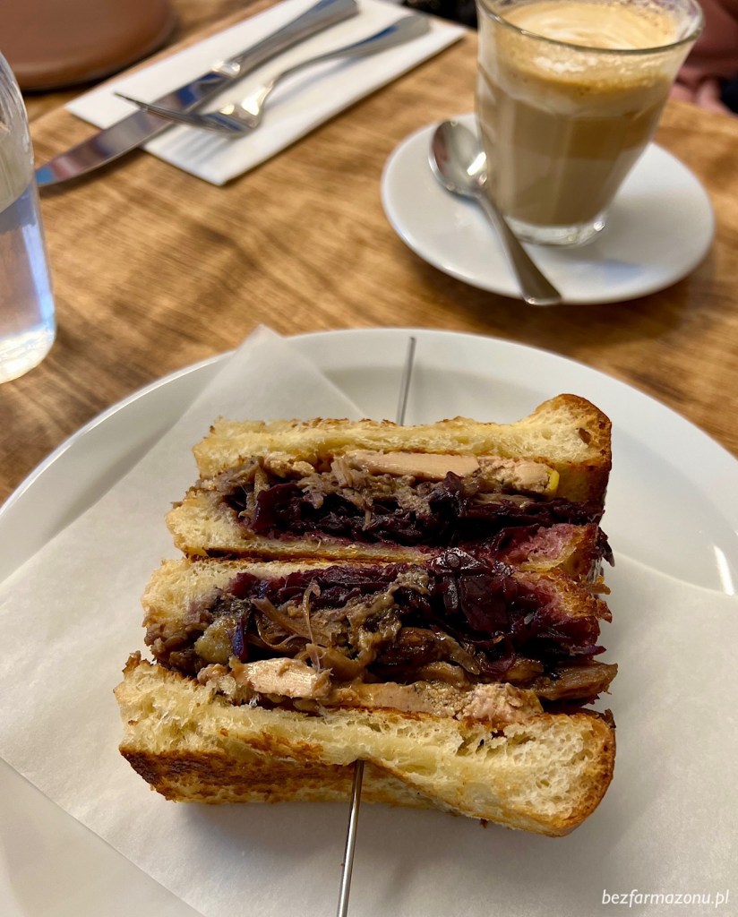 W pieczywie ukryto również świetne, miękkie i bardzo soczyste confitowane kacze udko wraz z modrą kapustą w rokitniku. Kanapka smakowała wybornie. Była miękka, soczysta, kwaśno – słono – słodka – bez dwóch zdań doskonała!