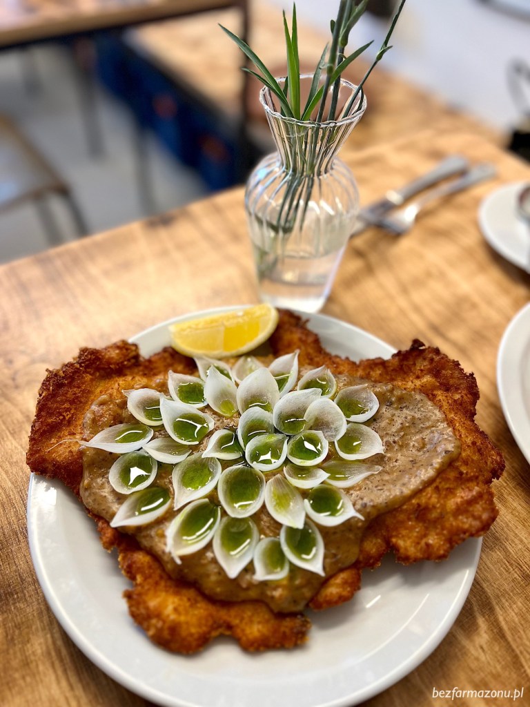 Schabowy (56 PLN) wielkości talerza perfekcyjny. Cienko bity i dobrze przyprawiony o chrupiącej na brzegach panierce.